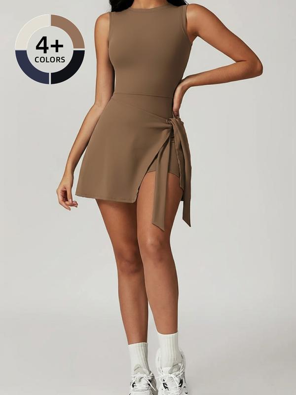 Women's Round Neck Tennis Athletic Dress, Sleeveless Design, Side Slit & Built-In Shorts, Golf Sports Skirt Pants, Backless Sport Romper