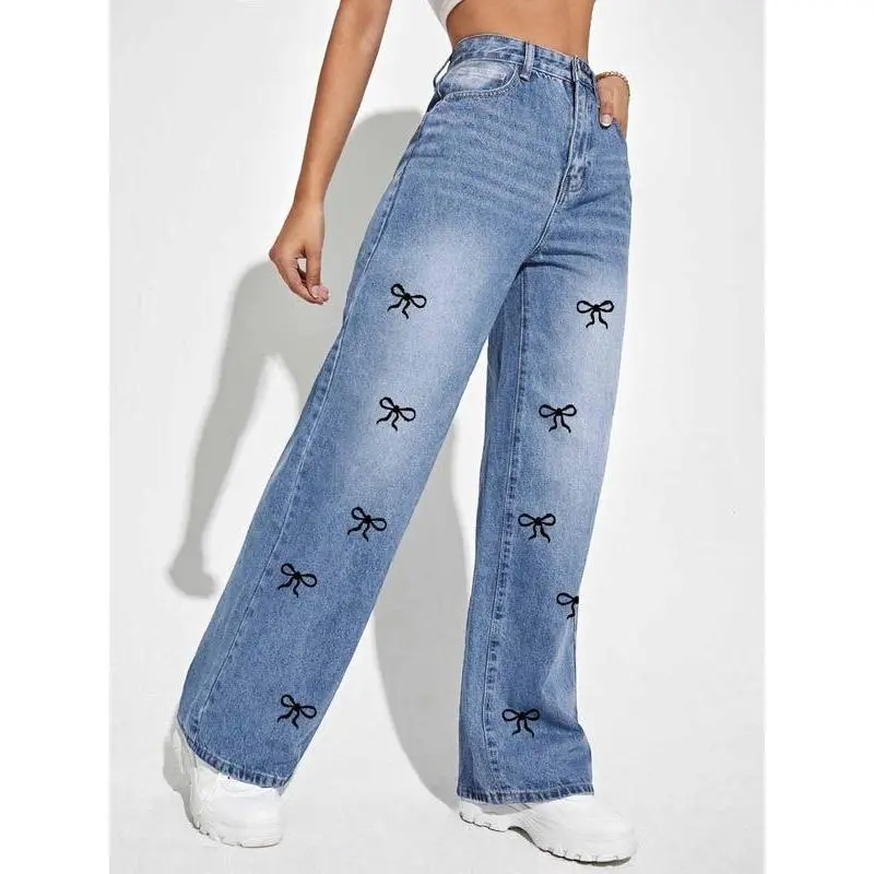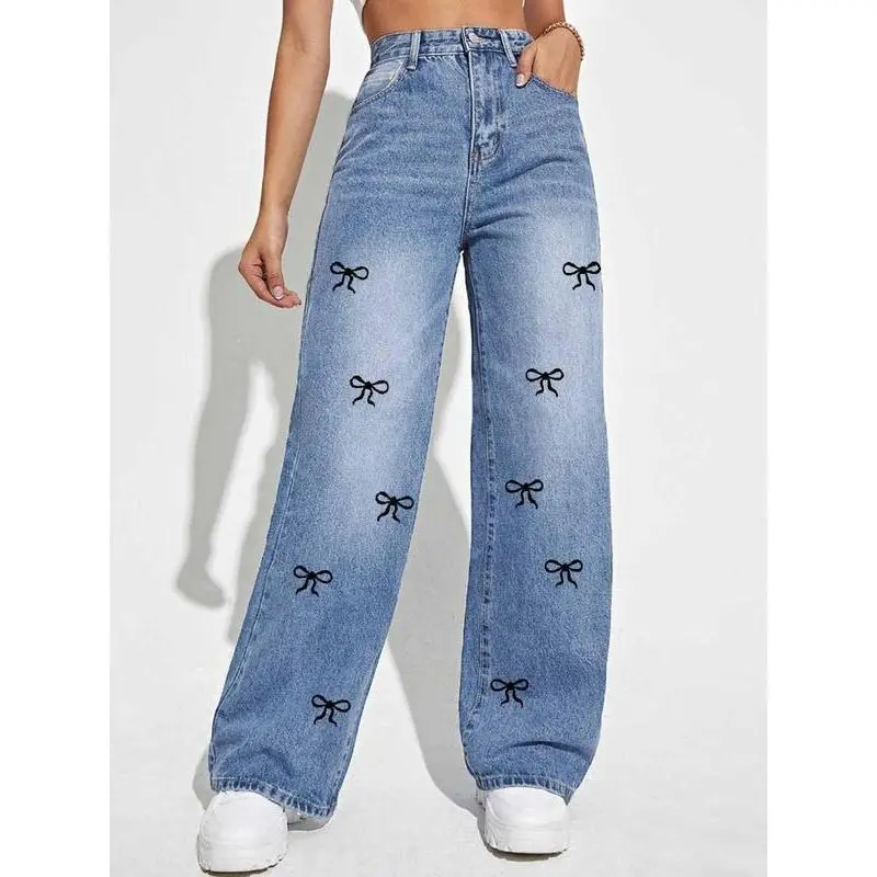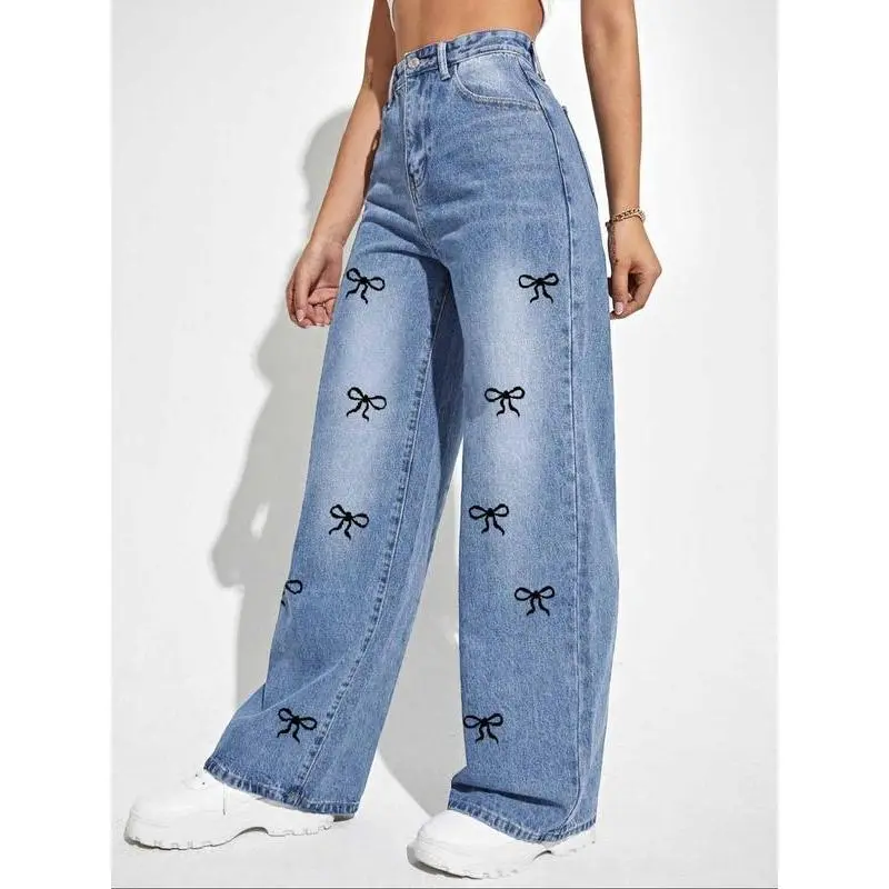 Women's Bow Print Denim Jeans, Casual Comfy Jeans for Daily Wear, Jeans for Women, Ladies Bottoms for All Seasons, Jeans(gift)