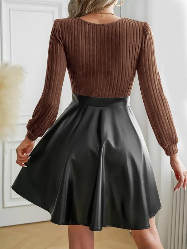 A-Line Dress with Faux Leather Skirt and long sleeve soft, ribbed, scoop neck top. Add a belt for a more elevated look. Click through to view the color combos still available.#alinedress #leatherdress #stylishdress