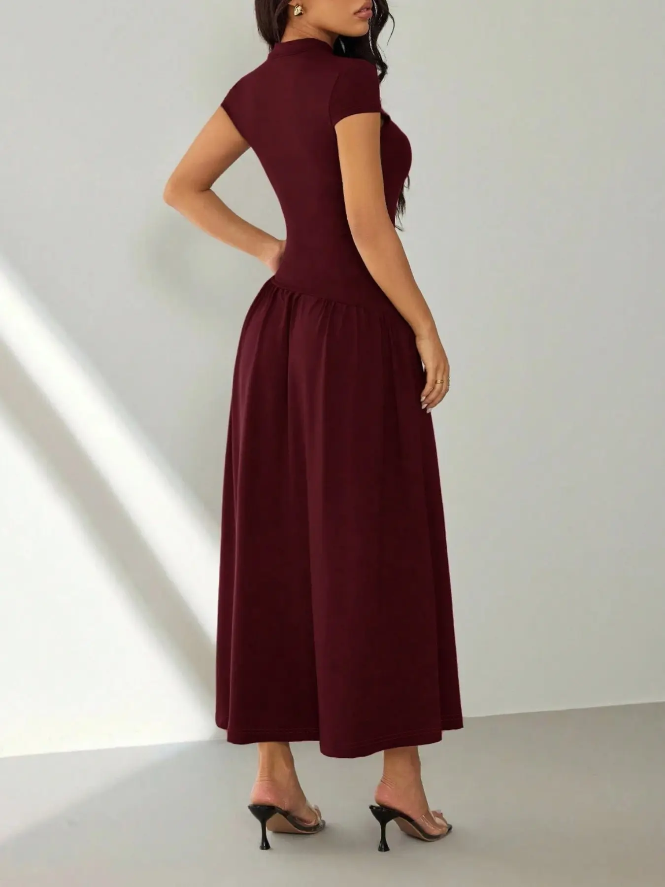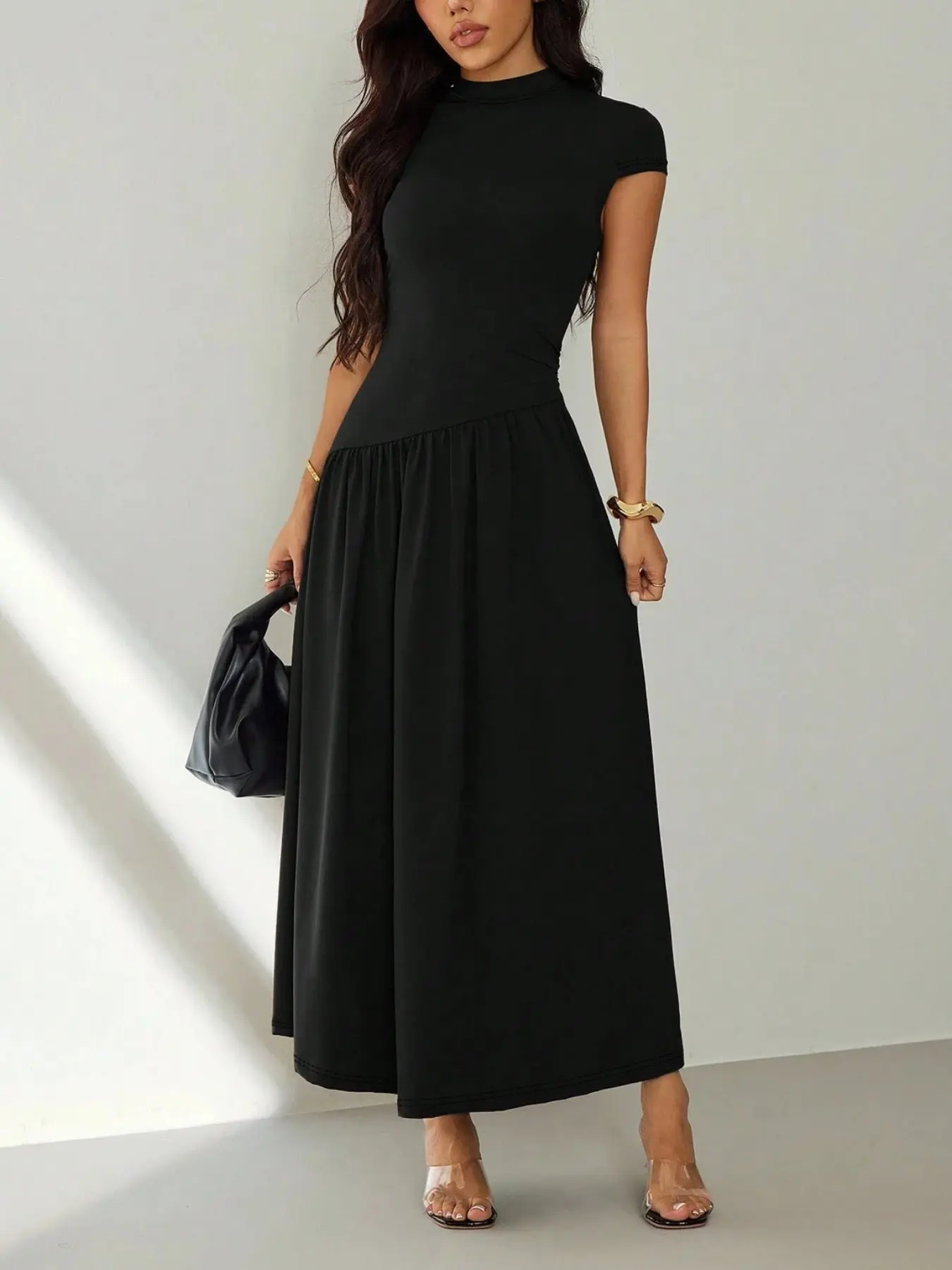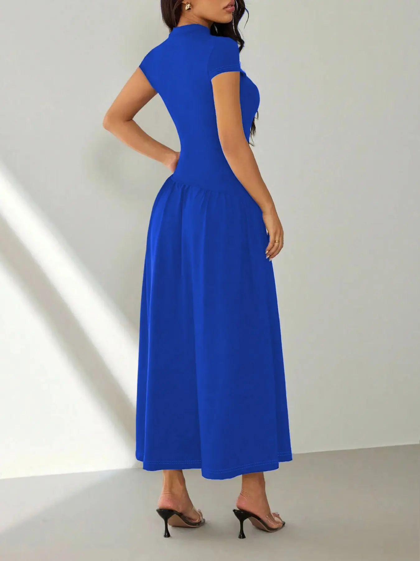 5. Women's short-sleeved pleated slim-fit solid casual dress, perfect for dates, parties, clubs, and commuting, Womenswear
