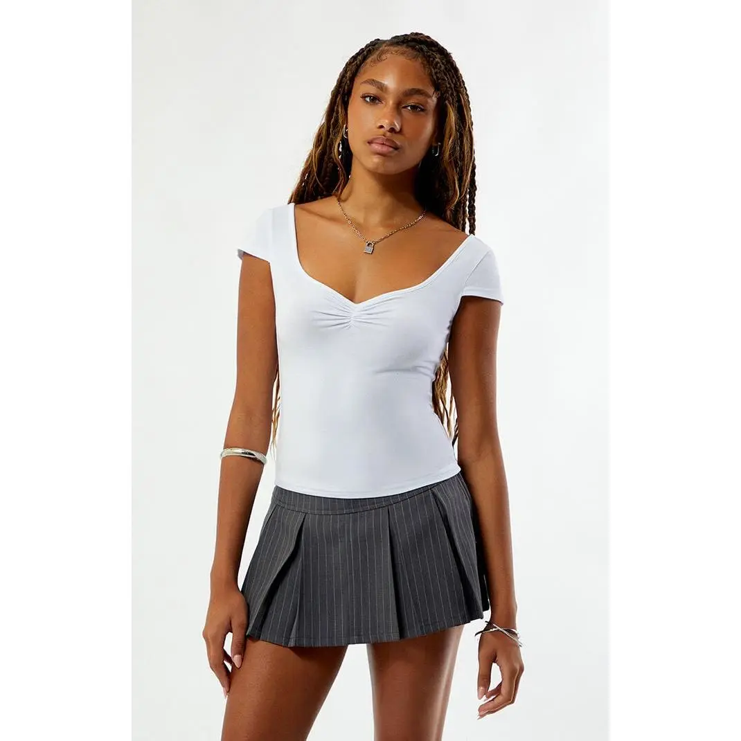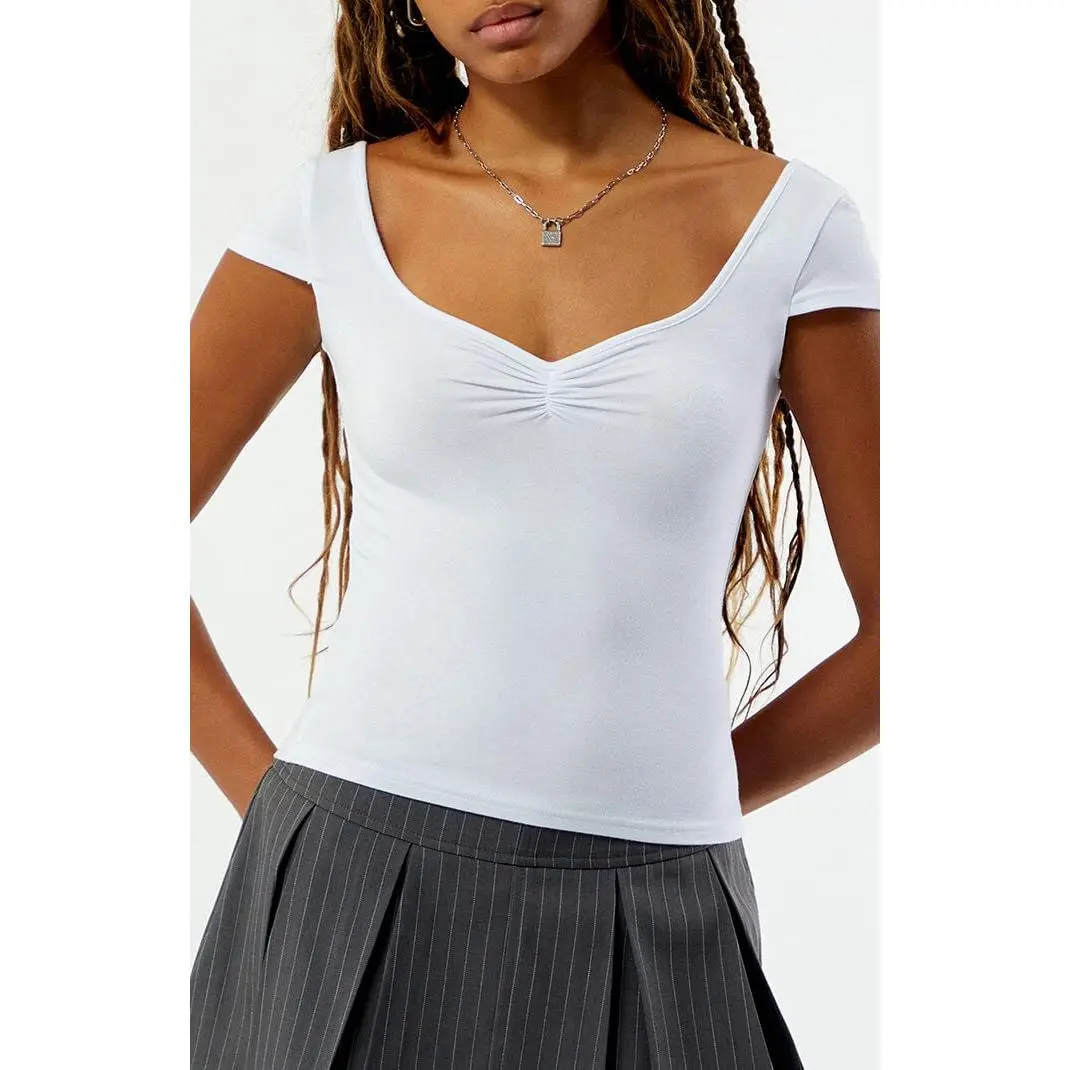 The Eleanor Ruched V-Neck Top from Your Favorite is a flirty essential with a modern, feminine edge. Designed with a scoop neckline, cinched front detail, short cap sleeves, and a slim-fit silhouette, it’s the perfect mix of effortless comfort and standout style.