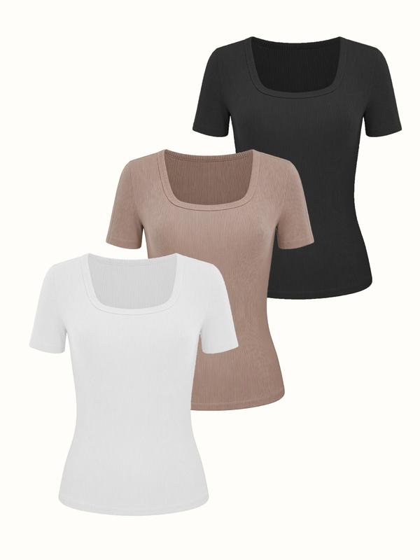 Women's Casual Slim-Fitting Short Sleeve Top, 3-Pack Plain Ribbed Square Neck T-Shirt, Medium Stretch Summer Basic Wear