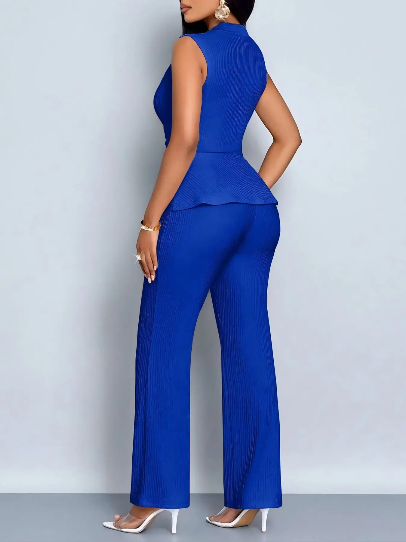 【Flared trousers】: Featuring flared trousers, this outfit adds a dynamic touch, creating an elongated appearance that enhances leg length.