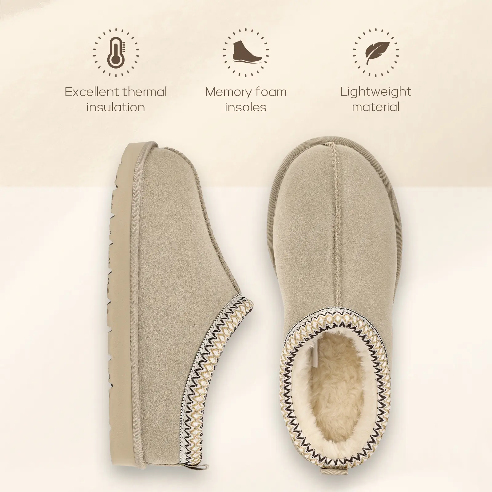 Not too impressed with these for the price they're asking. The inner fuzzy peaks out the top and the trim is already unraveling right out of the box. The bottoms are slippery and don't have good traction either.