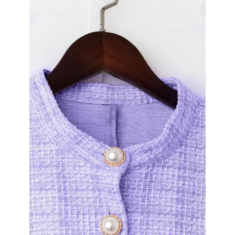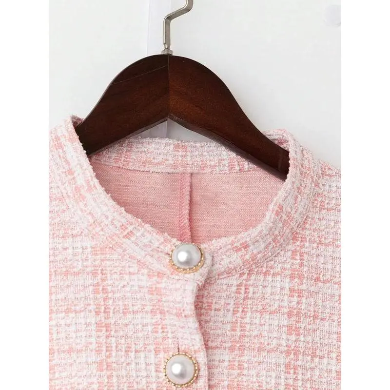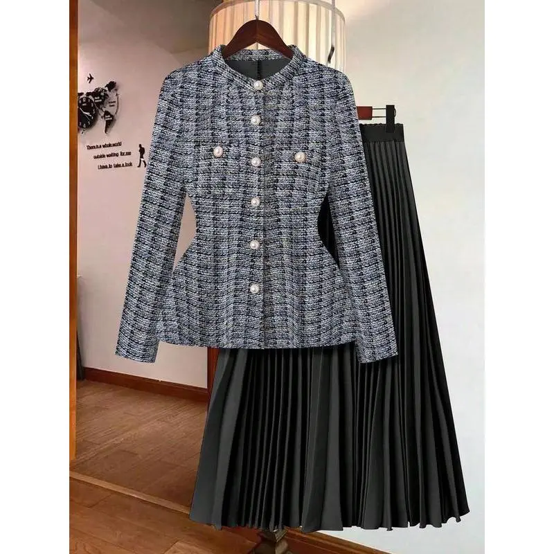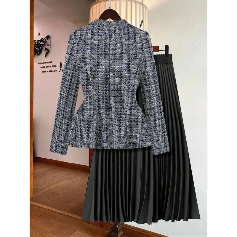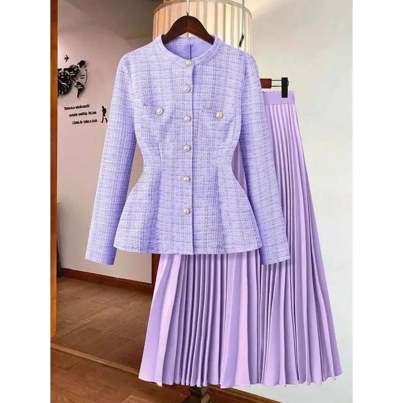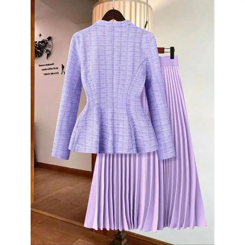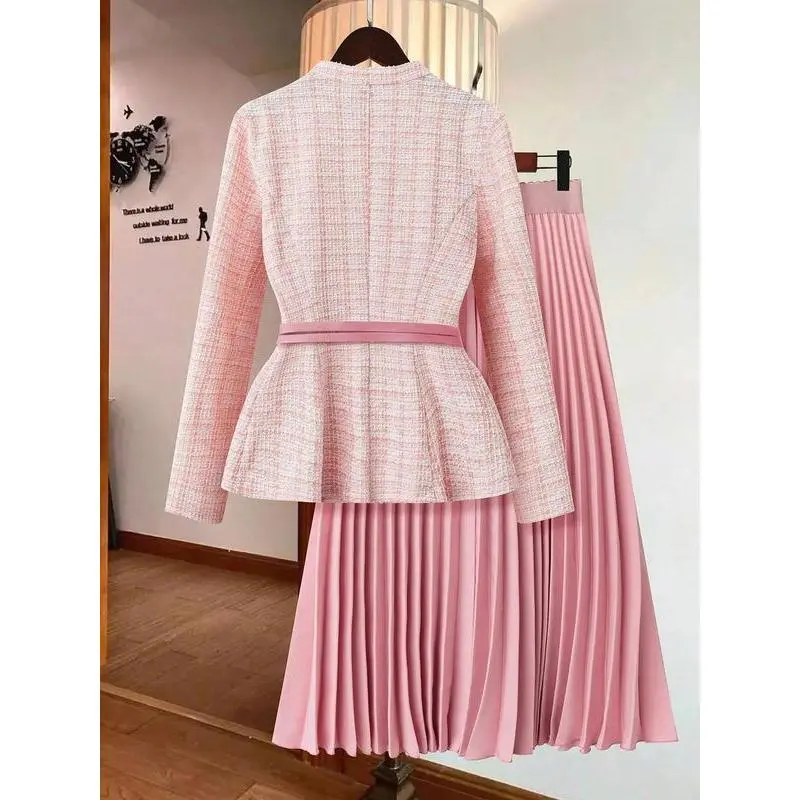?? Two-piece Set??: The product is a coordinated two-piece set, allowing for easy matching and combination with other wardrobe items.?? Fitted Construction??: Features a fitted silhouette that enhances body shape, providing a flattering look without compromising ease of wear.?? Woven Fabrication??: Crafted from woven fabrics, ensuring durability and a structured appearance, suitable for various occasions during spring and fall.?? Moderate Thickness??: Designed with moderate fabric thickness, making it comfortable for transitional weather without feeling overly warm.?? Plain Pattern??: Showcases a plain pattern that offers a timeless aesthetic, allowing for effortless pairing with accessories.