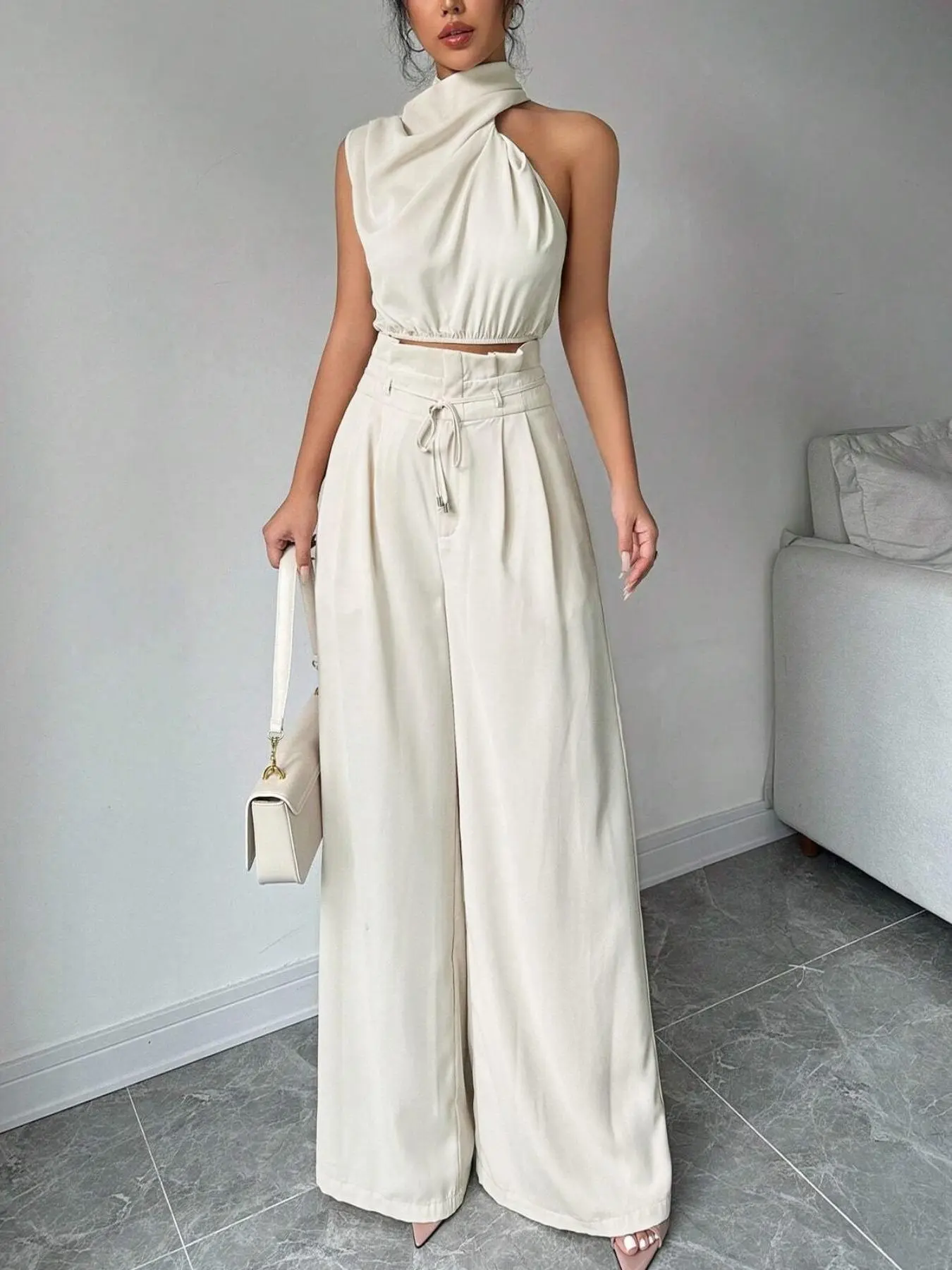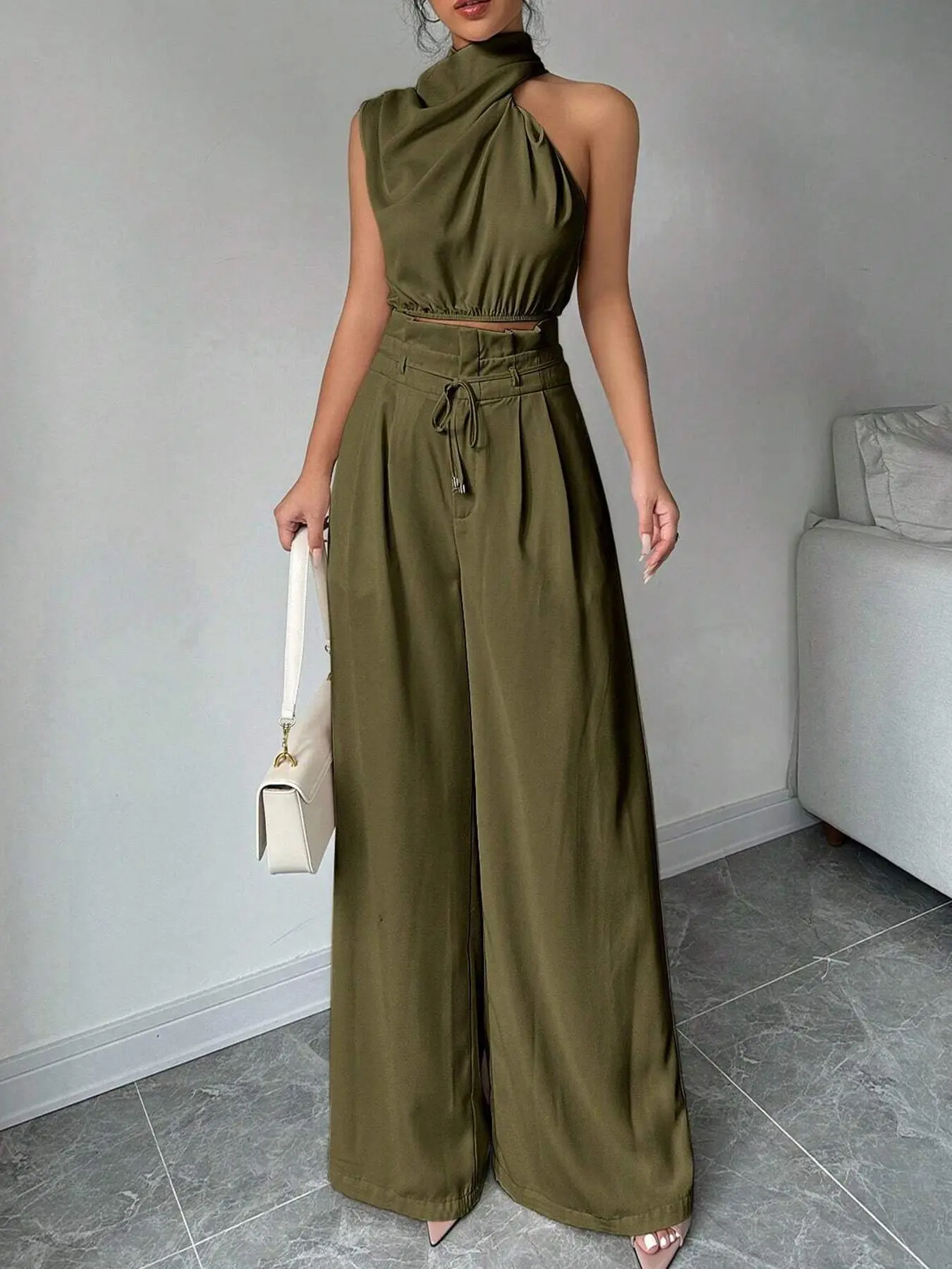 レディース 無地ホルターネッククロップトップ&ワイドレッグパンツ セット、エレガントカジュアル夏、女性の普段使いに最適 #レディーススーツ #kidsfashion #レディースアパレル #ミニワンピース #ニットワンピース #shakiracollection #saree #マタニティファッション #ロングワンピース #スウェットシャツ