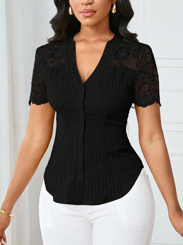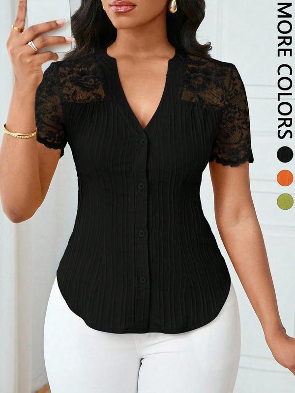 Lace patchwork top, elegant & slim, office-ready! 🧵✨ #shortsleeve #lace #shirt #womensfashion #tiktokmademebuyit