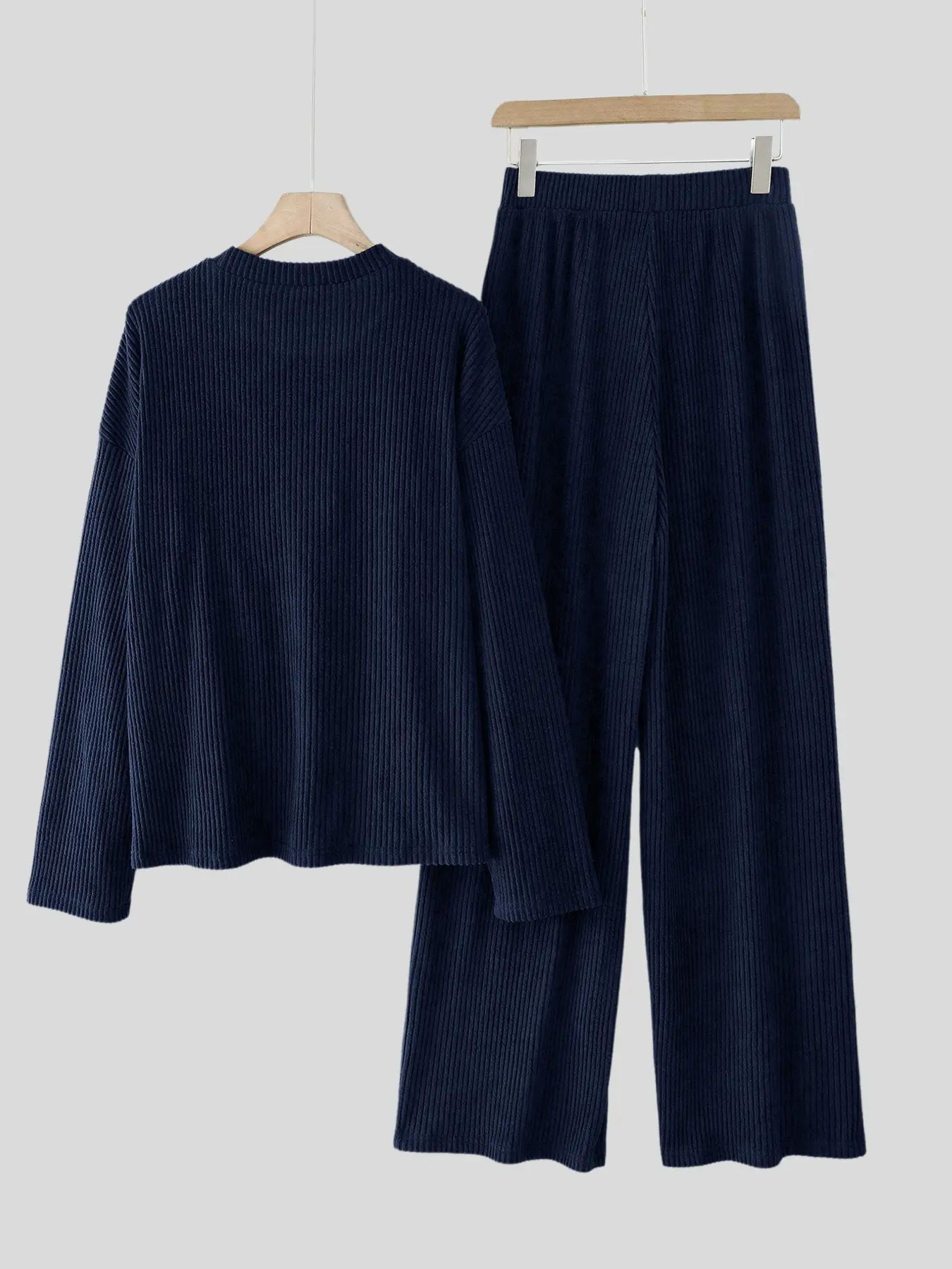 5. Women's Solid Color Round Neck Drop Shoulder Long Sleeve Knit Top and Loose Wide Leg Pants Set, Casual Home Wear, Comfortable and Versatile