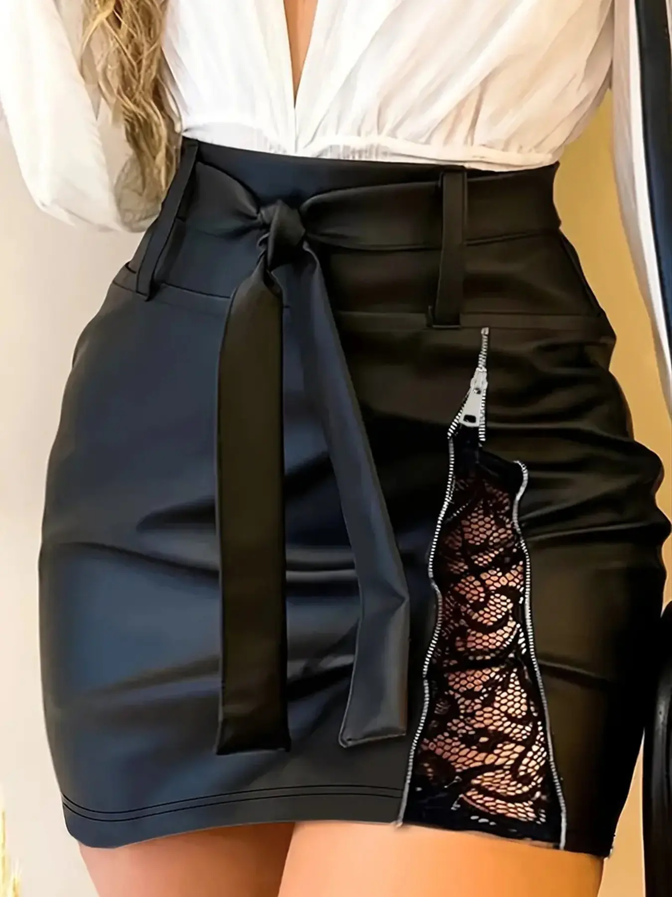 Aswulk Women's Solid Color Lace Patchwork PU Skirt with Zipper and Thin Fleece Inner Lining, Fashionable Bow Belt Mini Skirt for Daily Outdoor Wear, Ladies Bottoms for Spring & Fall & Winter Black Chic