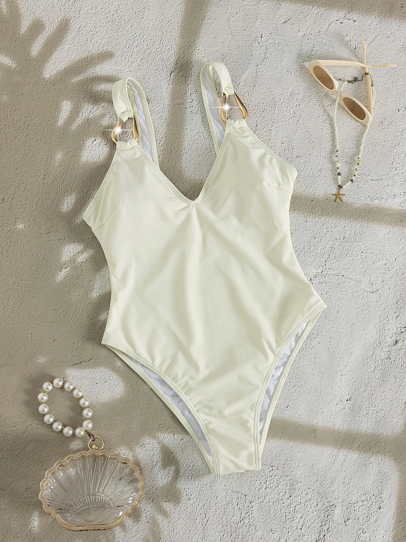26 years spring/summer new women's solid color bra one-piece swimsuit, Tummy control swimsuit, with adjustable shoulder strap design, equipped with decorative metal buttons, retro beach holiday outfit, suitable for pool party, seaside vacation