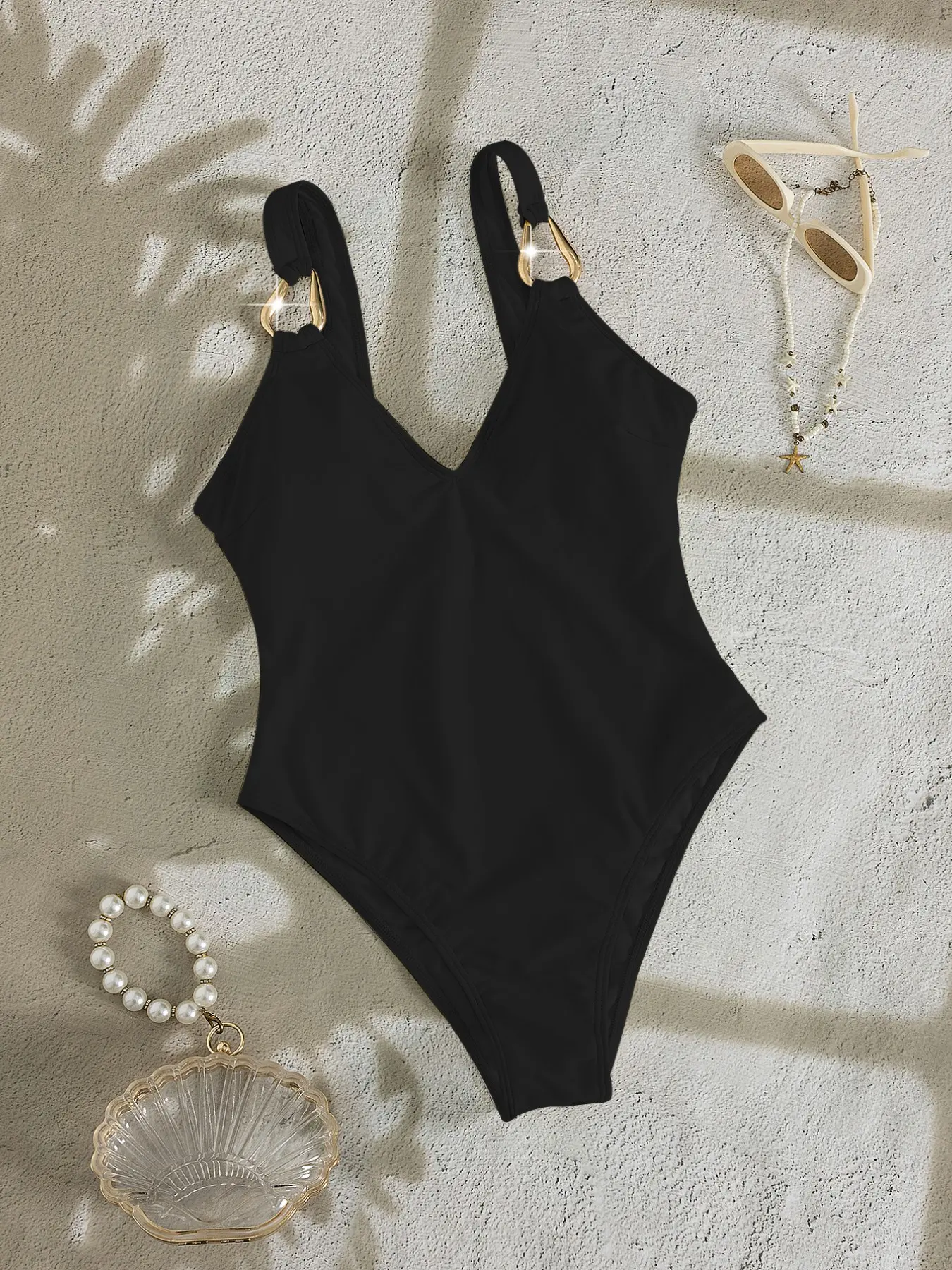 5. 26 years spring/summer new women's solid color bra one-piece swimsuit, Tummy control swimsuit, with adjustable shoulder strap design, equipped with decorative metal buttons, retro beach holiday outfit, suitable for pool party, seaside vacation