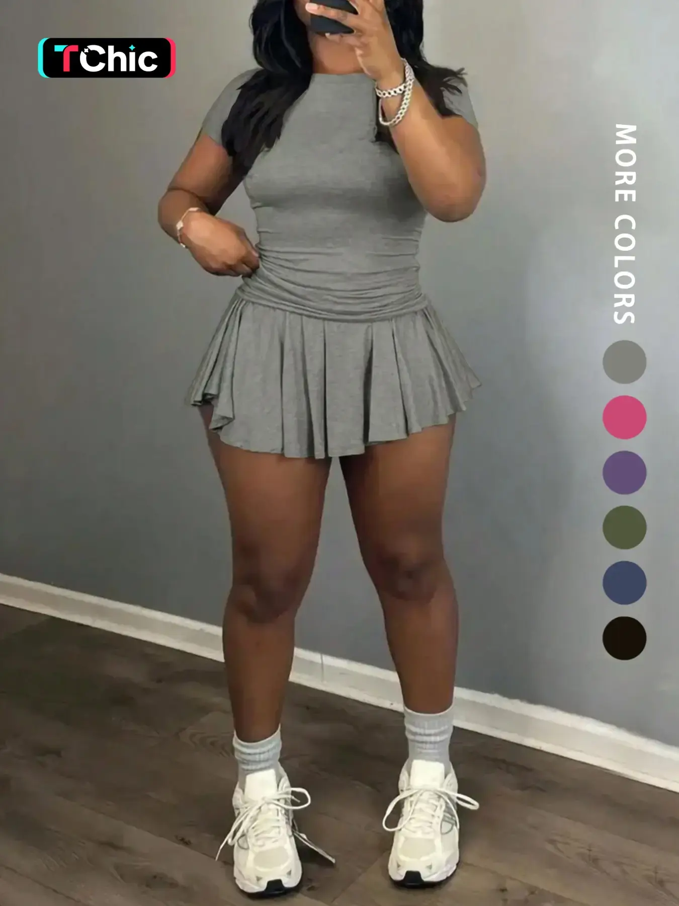 ☀️✨ This solid color tee and skort combo is giving sporty meets chic with zero effort required. The round neck short sleeve top keeps it classic, while the skort gives you the look of a skirt with the freedom of shorts.#twopieceset #casual #womensfashion #spotlightfinds #tiktokshopspringglowup