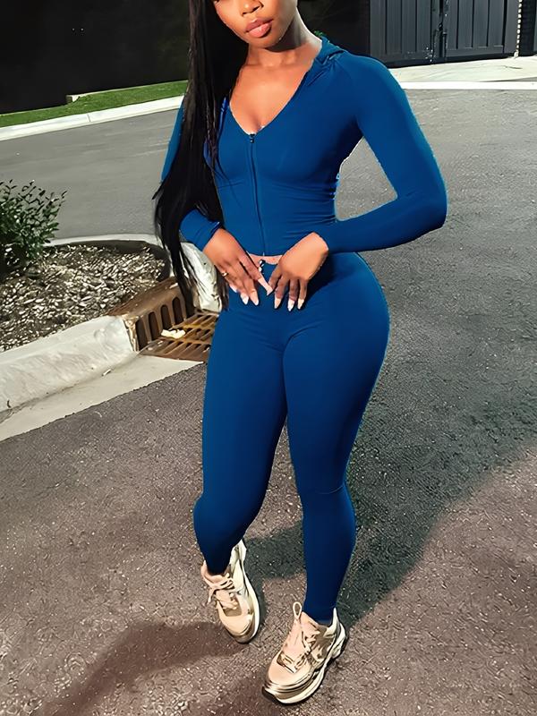 Women's Solid Color Zipper Jacket & Tight Pants Set, Casual Long Sleeve Hooded, All-Season Sports Wear, Available in S-Xxl Sizes #activewear #tracksuit #gymclothes #joggerset #athleticwear #workoutfits #thermaljumpsuit #sweatsuitset #sportwear #athleisurewear