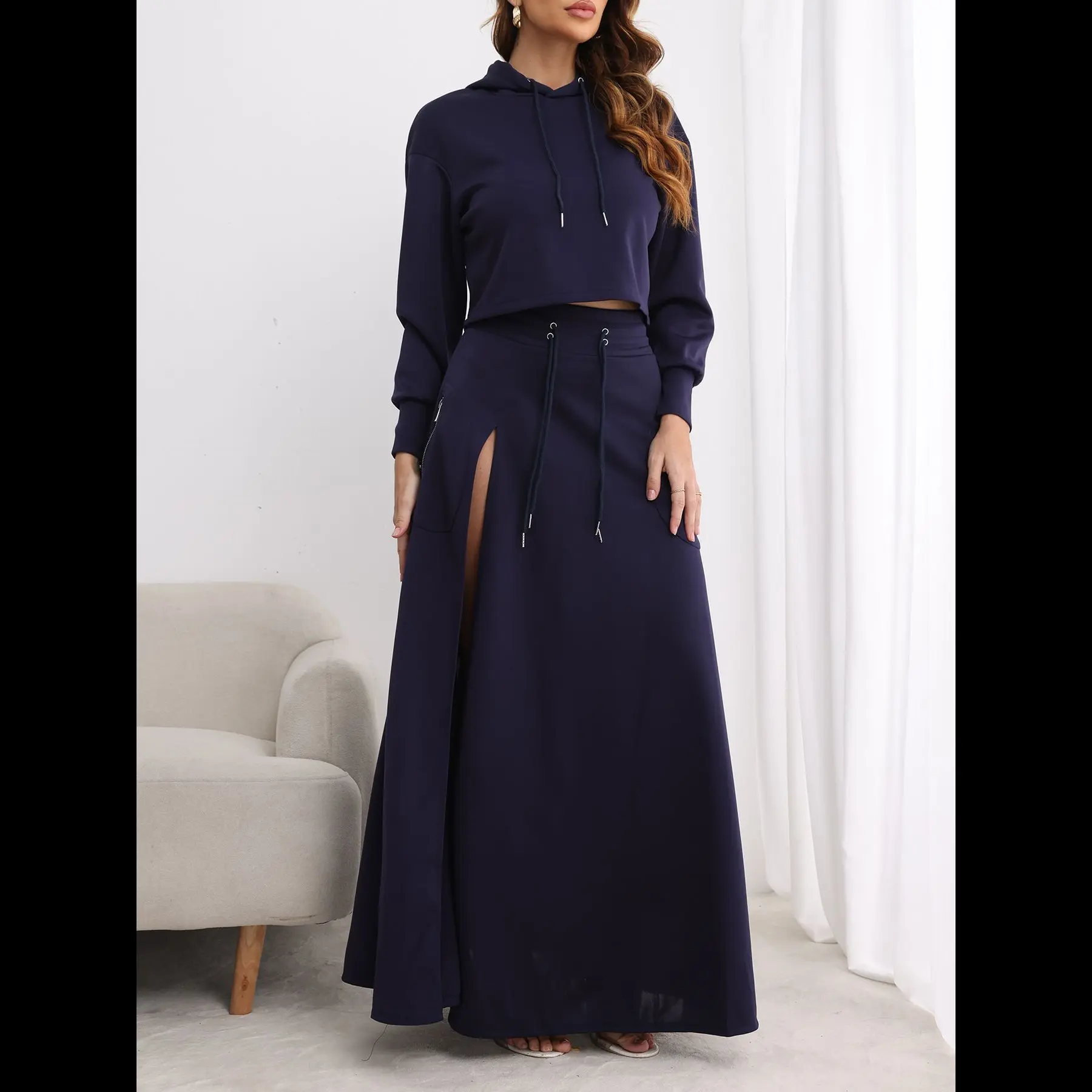 Women’s Solid Drawstring Hoodie & Split-Thigh Skirt Set – Elegant Long-Sleeve Top & Pocketed Long Skirt, Casual Fashion, Cozy Co-ord Set, Regular-Length, Navy Blue