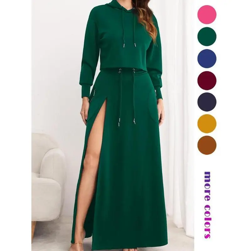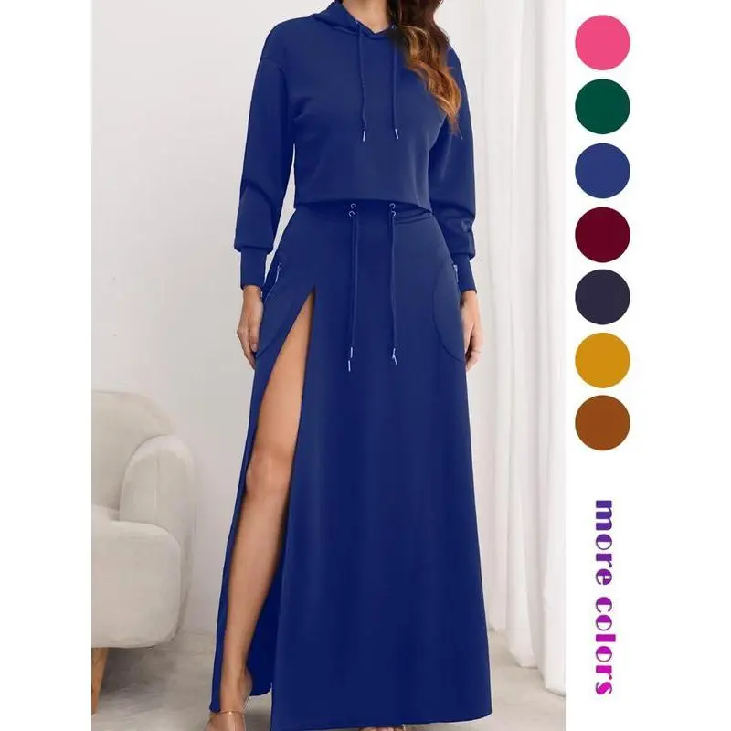 Women's Solid Drawstring Hoodie & Split Thigh Skirt Set? Elegant Simplicity? Indulge in the elegance of simplicity with a plain pattern, hooded necklines, and dropped shoulder sleeves. This set offers a chic look with a touch of understated sophistication. Perfect for those who appreciate clean, classic styles.?? Slight Stretch Comfort?? Experience gentle flexibility with the slight stretching feature. It enhances movement while ensuring a snug, flattering fit. The drawstring design and high waist provide a tailored, personalized fit that flatters your figure and enhances comfort.?? Functional Elegance?? Enjoy the practicality of pockets combined with a split thigh skirt. This blend of functionality and elegance in your ensemble makes it versatile for various occasions. The set is crafted from textiles with a knitting weaving method, ensuring durability and softness.