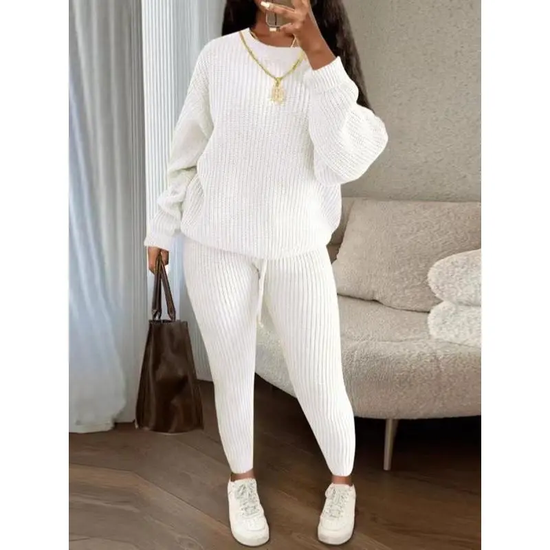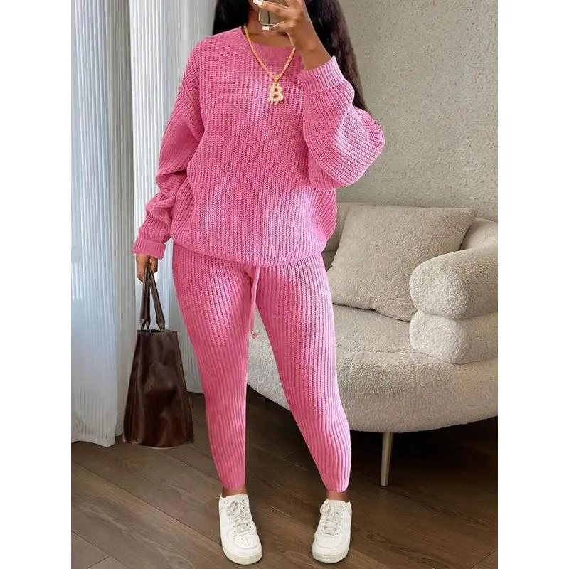 Women's Solid Drop Shoulder Sweater & Drawstring Waist Pants Knit Set, Casual Cozy Knitwear for Daily Outdoor Wear, Ladies Fall & Winter Outfits, Women's 2 Pcs Sweater Set