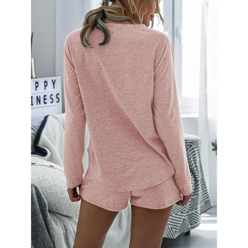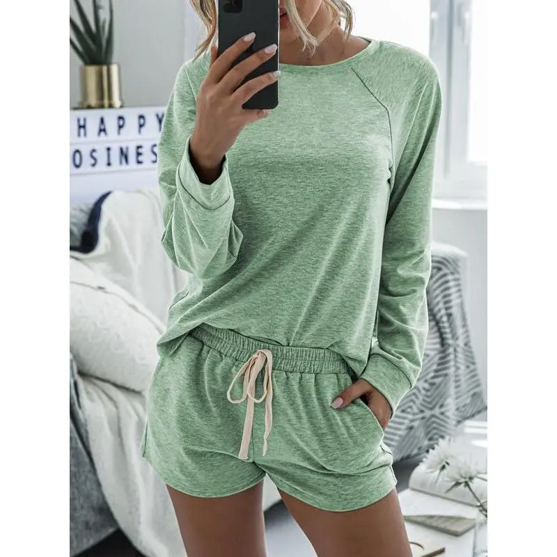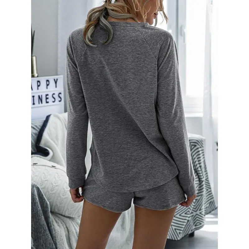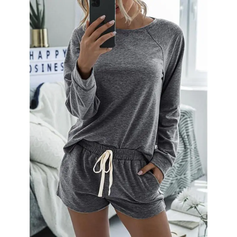 Women’s solid raglan-sleeve tee and drawstring-waist shorts loungewear two-piece set; casual, comfortable round-neck top and pocket shorts pajama set; women’s sleepwear; ladies’ sleepwear for spring and fall; basic dusty blue homewear.