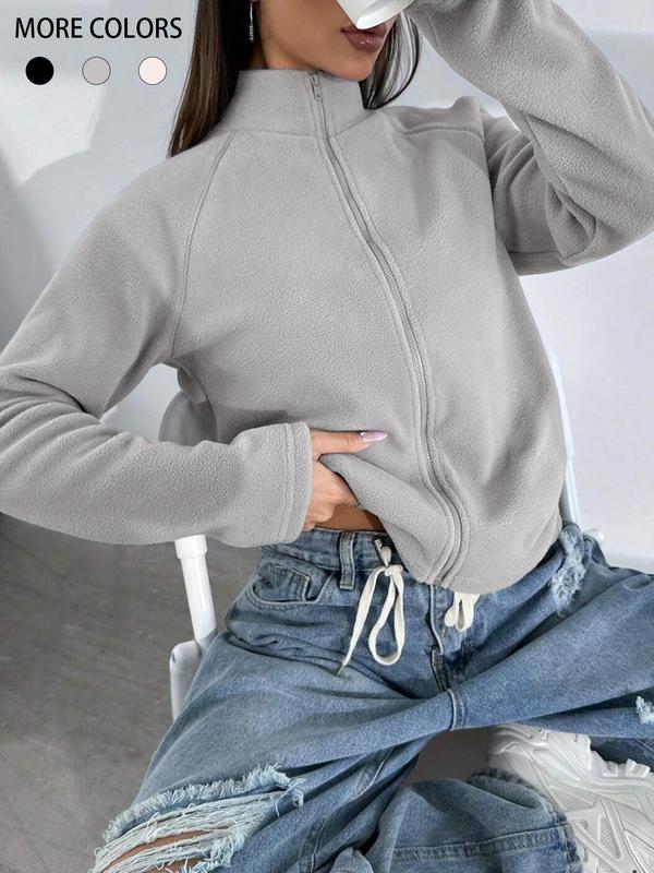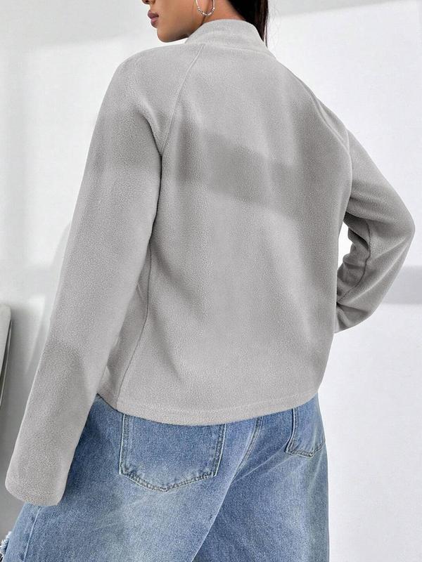 Women's Solid Raglan Sleeve Zip Up Polar Fleece Jacket, Casual Long Sleeve Stand Collar Outerwear for Spring & Fall, Ladies Clothes for Daily Wear