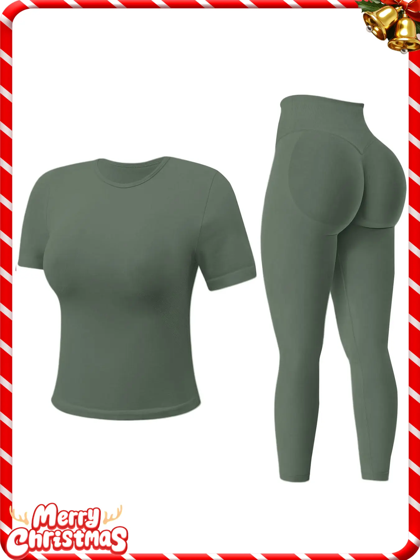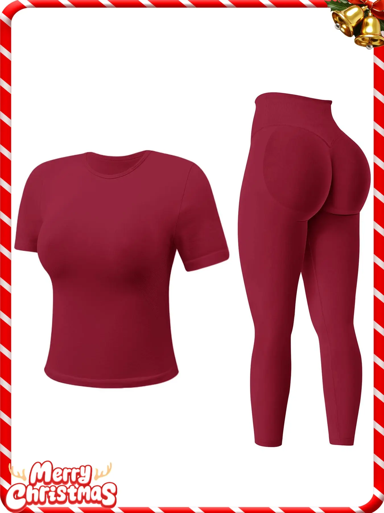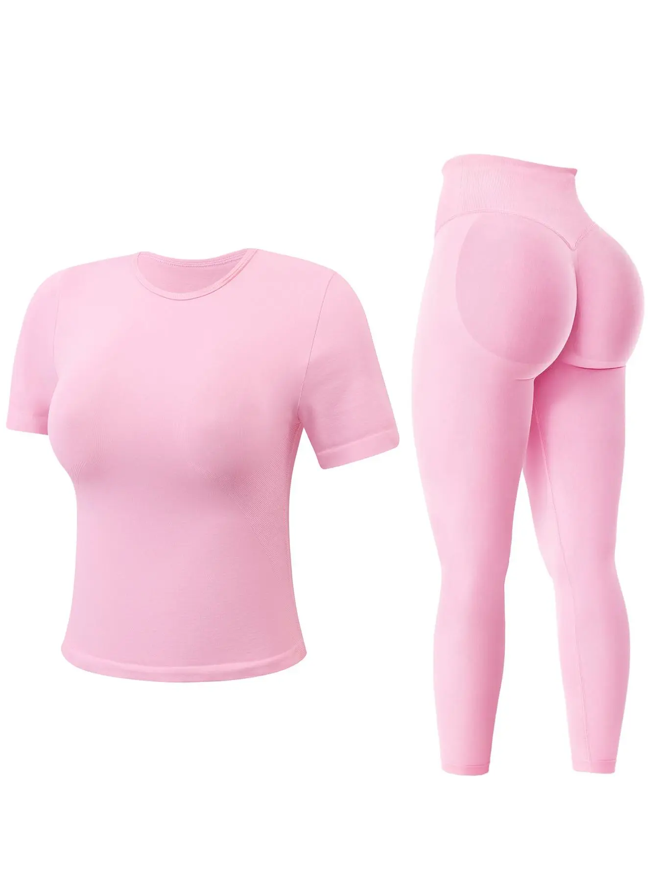 Seamless Workout Sets for Women 2 Piece, Women's Sporty Slim Fit Knitted Set, Round Neck Seamless T-Shirt Tank Top + Mid Waist Butt-Lifting Pants, Outdoor Running Yoga GYM Tracksuit Sets for Women, Sportswear For Gym
