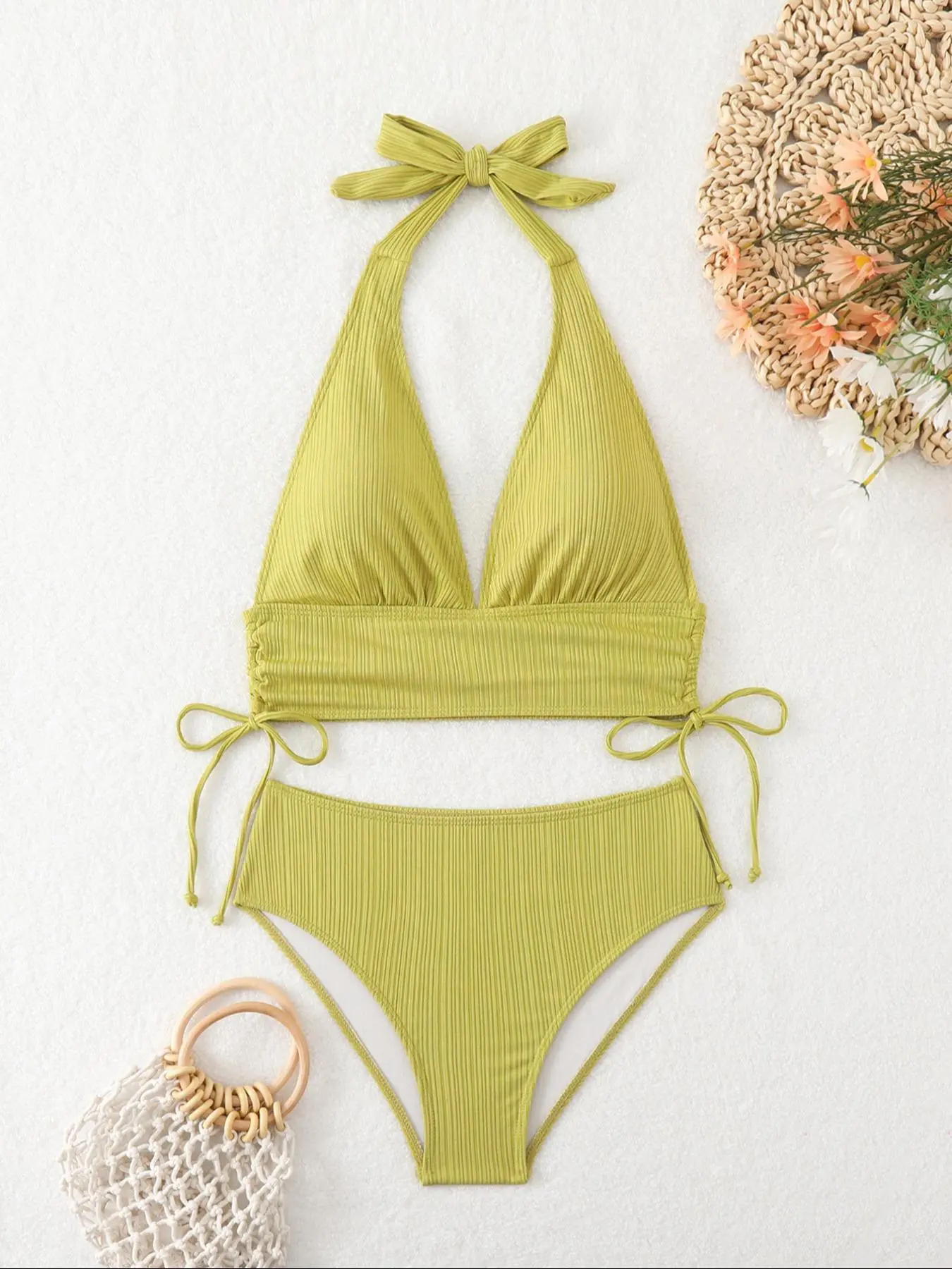 Two-Piece Set Women's Solid Color Bikini Set, Casual Fashion Chic Swimsuit Set, Ladies Swimwear for Beach Holiday Vacation