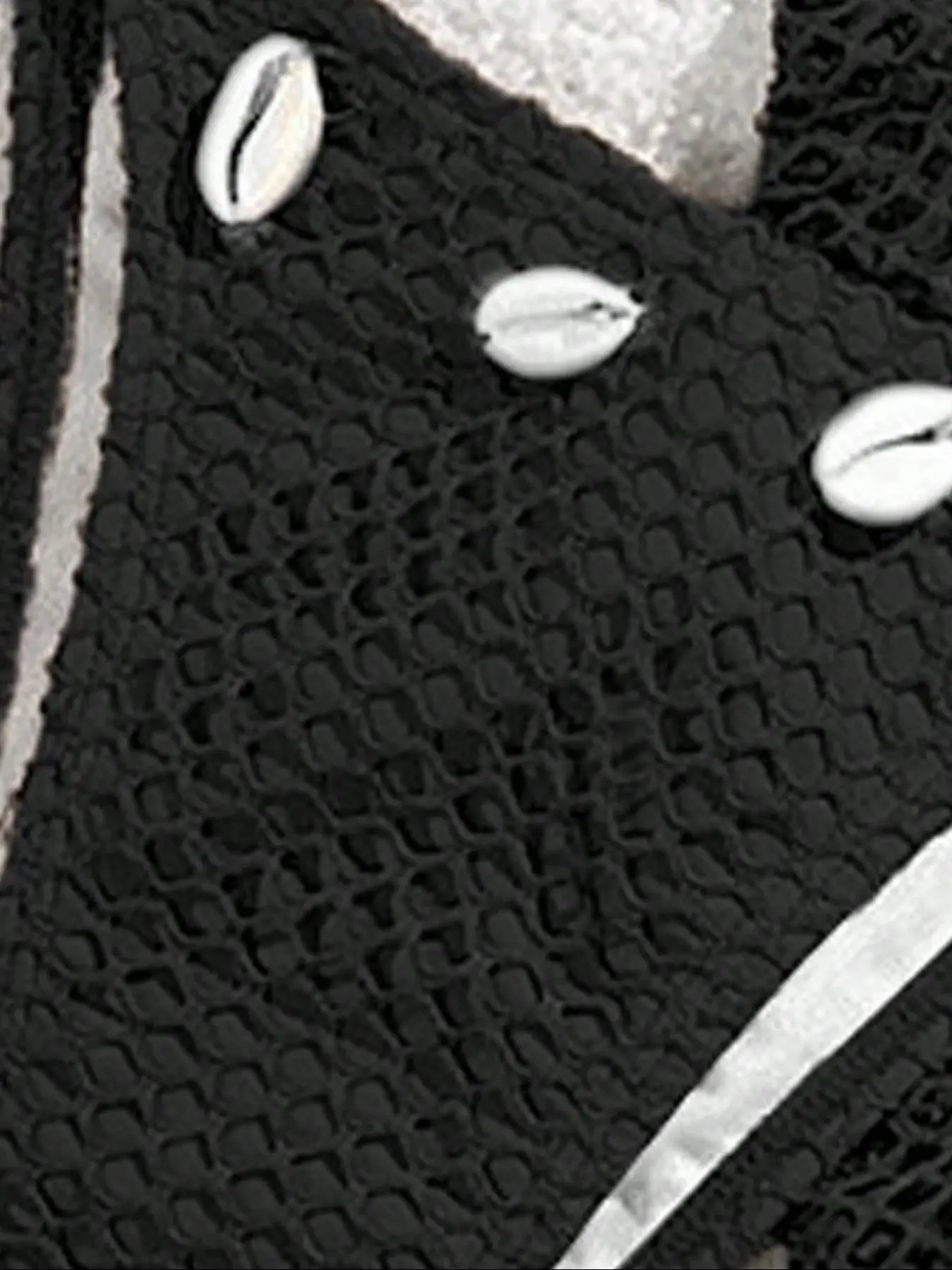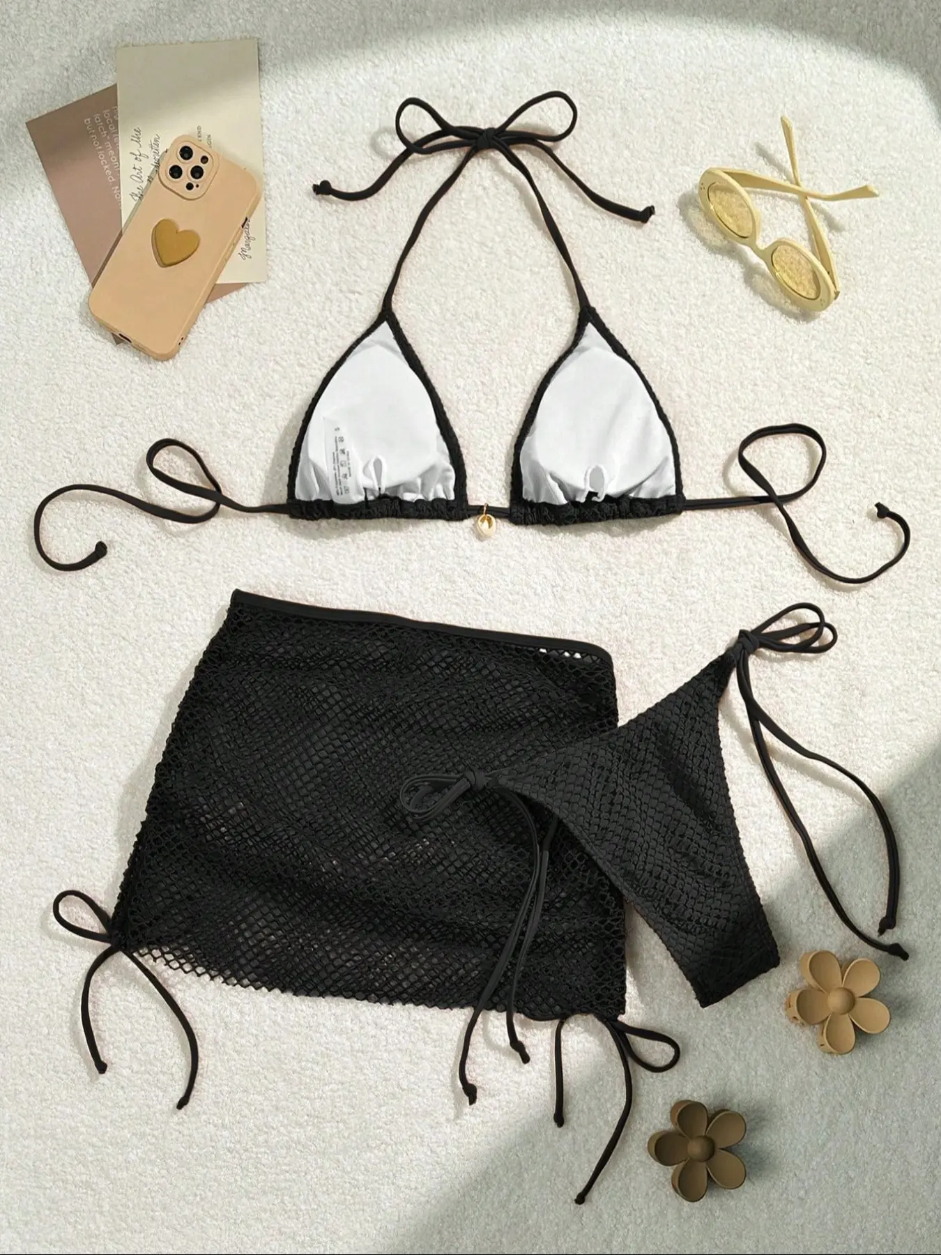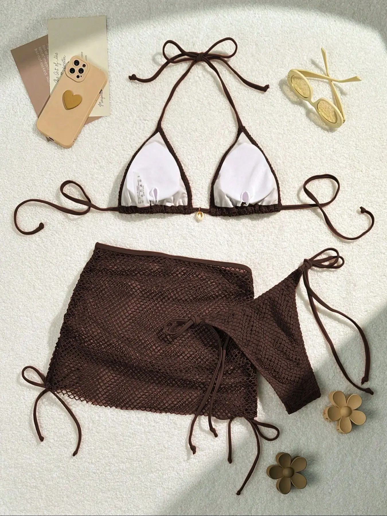 Three-Piece Set Women's Solid Hollow Out Design Halter Triangle Bikini Set, High Stretch Sexy Tie Back Backless Conch Pendant Decor Swim Bra & Drawstring Cover Up Skirt & Tie Side Swim Bottom, Fashion Tie Back Bikinis, Bikini Swimsuits