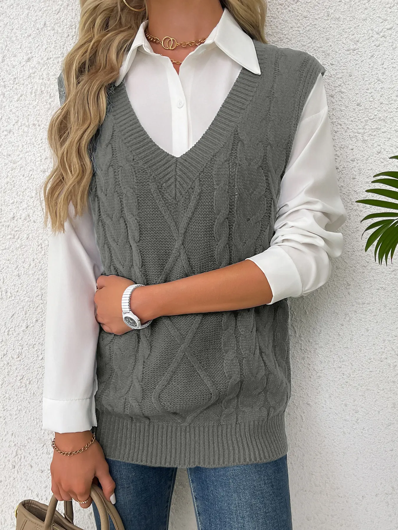 Women's Solid Textured V-Neck Sweater Vest, Casual Preppy Style Cable Knit Pullover for Fall & Winter, Perfect for Daily Wear #womenswear #fallclothing #womensclothing #womanfashion #viralshapewear #vikingsweater #womenssweatshirtset #prettygardensweatsuit #sweateroutfits #fallcardigan