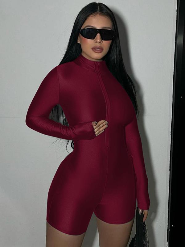 Women's Solid Zip Up Mock Neck Bodycon Romper, Casual Long Sleeve Jumpsuit for Fall & Winter, Women's Clothes for Daily Wear
