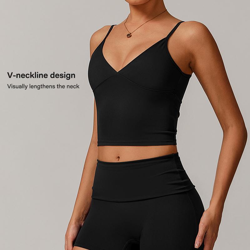 Women's spaghetti strap tank top with invisible bra padding, sexy deep V-neck pleats, comfortable wire-free sports bra, slim-fit outerwear basic top, suitable for yoga, fitness, and summer wear.Women's spaghetti strap tank top with invisible bra padding, sexy deep V-neck pleats, comfortable wire-free sports bra, slim-fit outerwear basic top, suitable for yoga, fitness, and summer wear.