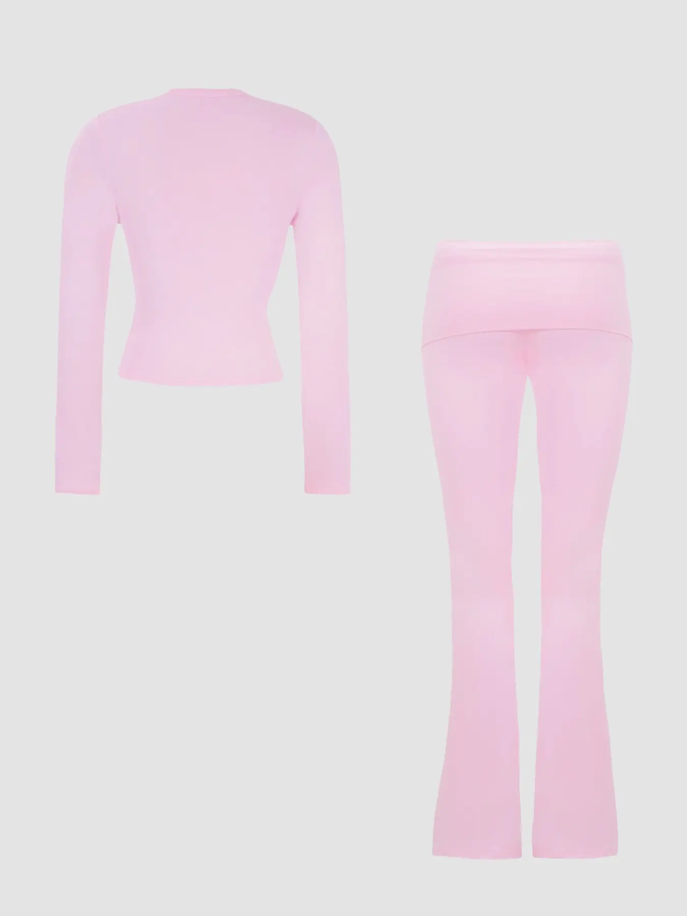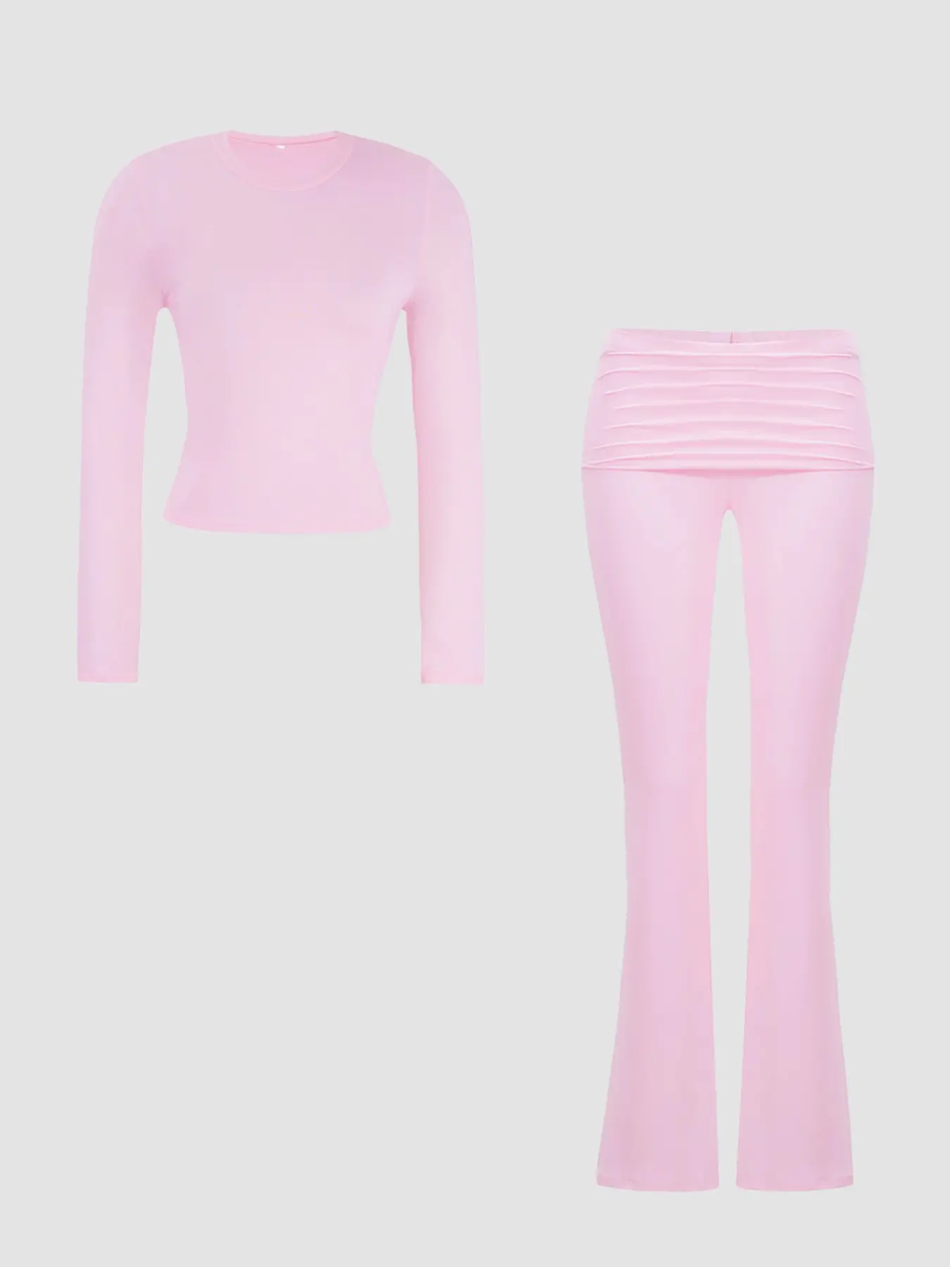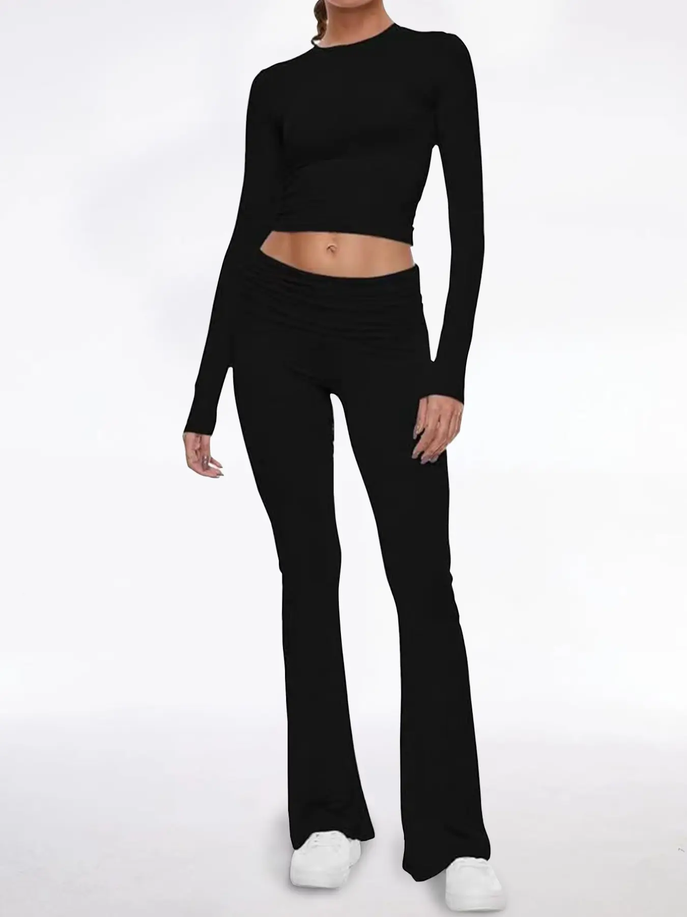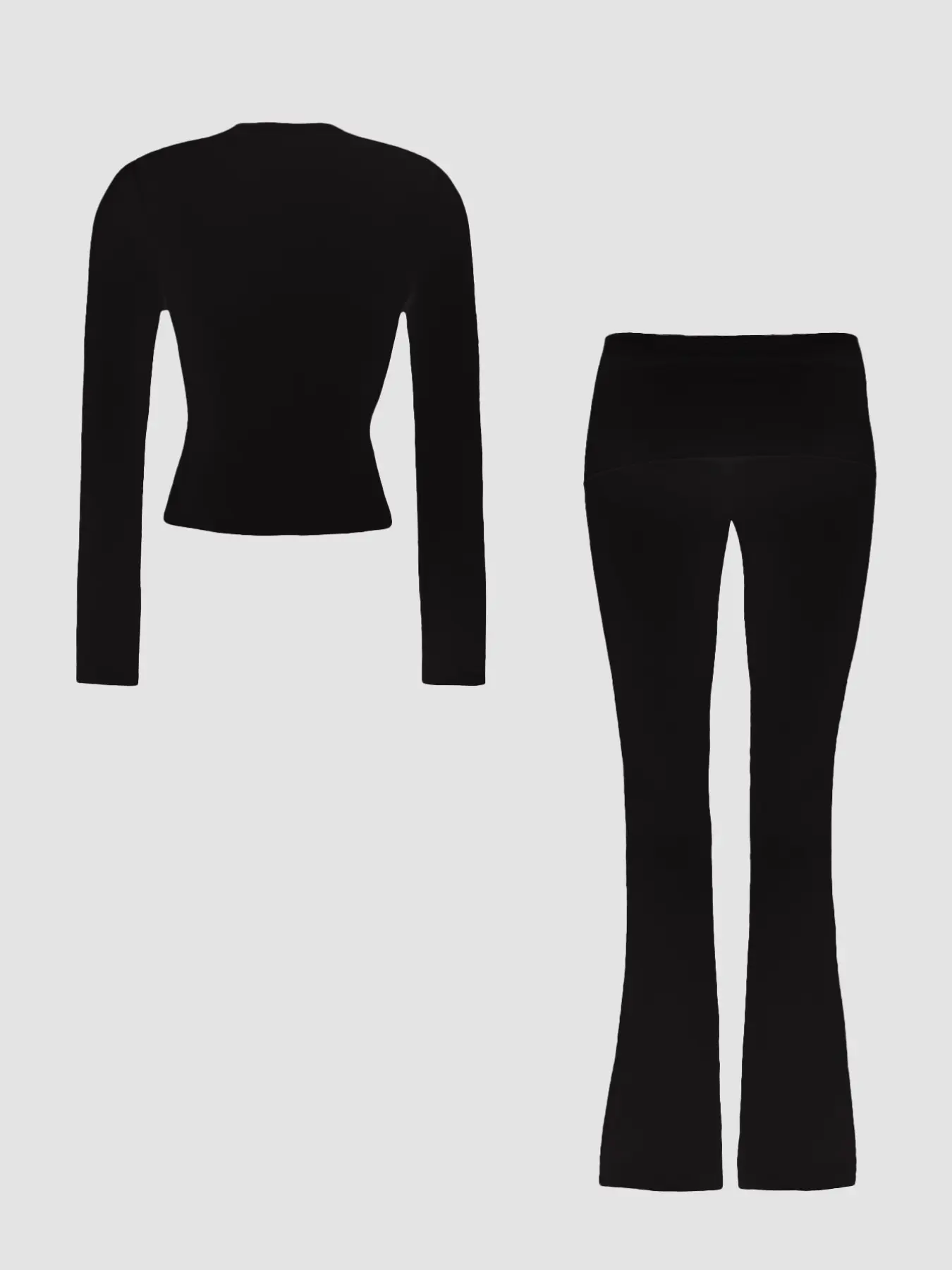 【Tee and Pants Set】: Includes a long-sleeve, foldable fitted tee paired with low-waisted flared pants for complete workout readiness.