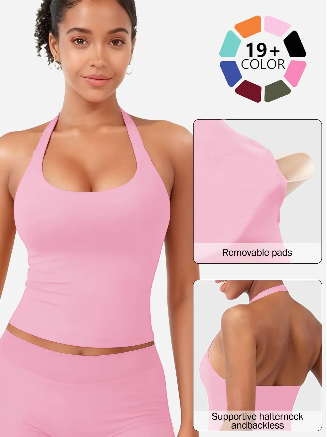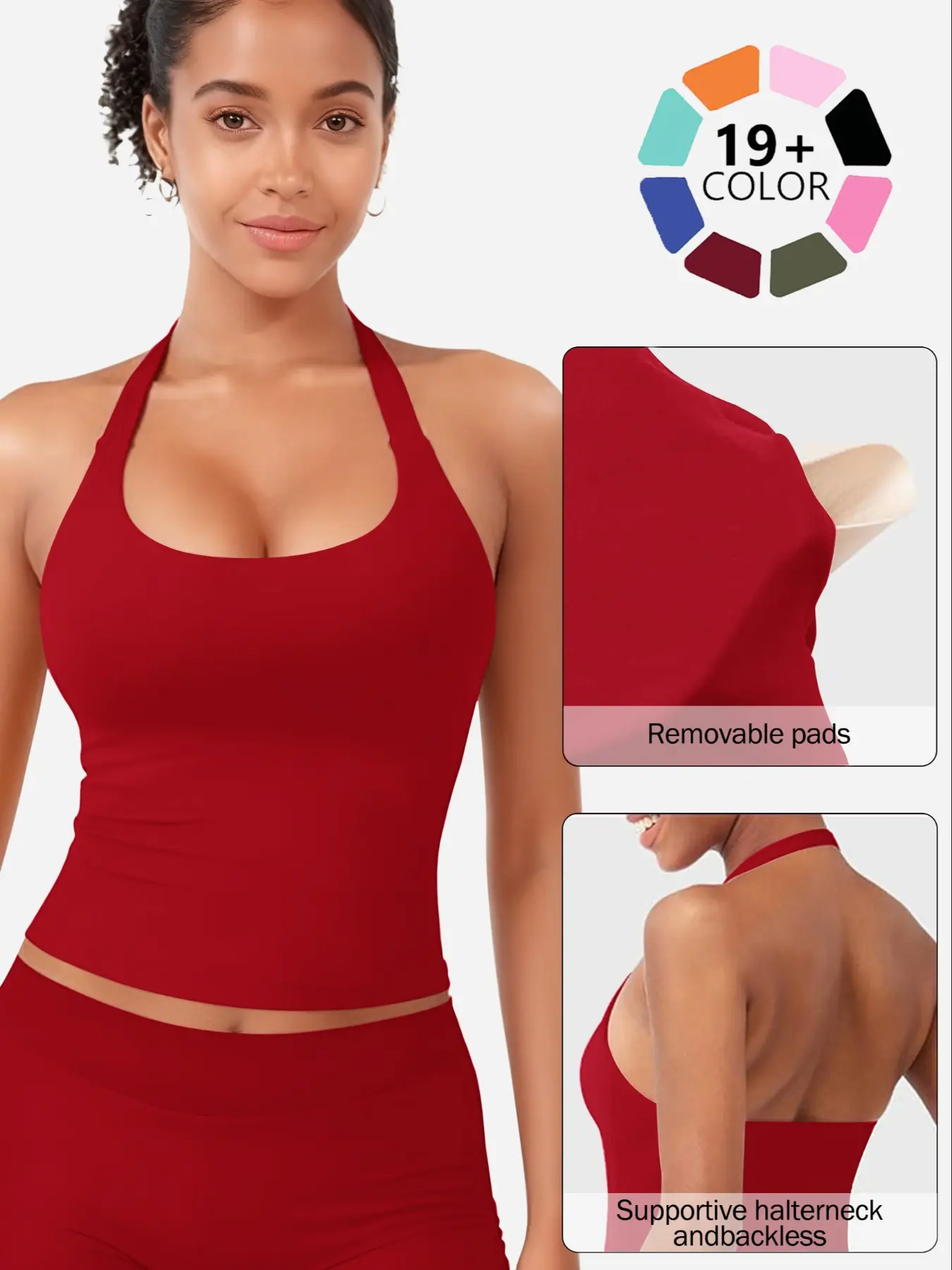 5. Women's Solid Removable Chest Pad Sports Tank Top, Casual Comfort and Durability Halter Neck Sports Top for Yoga Gym Workout, Ladies Sportswear for All Seasons, Backless Sports Vest, Hollow Back Activewear