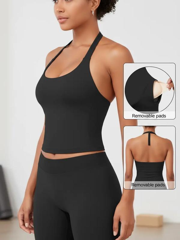 Women's Solid Removable Chest Pad Sports Tank Top, Casual Comfort and Durability Halter Neck Sports Top for Yoga Gym Workout, Ladies Sportswear for All Seasons, Backless Sports Vest