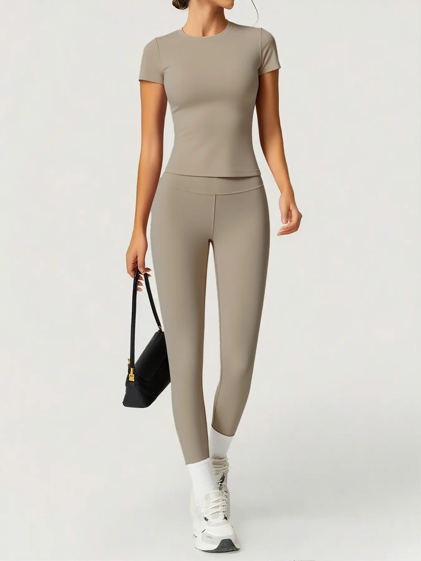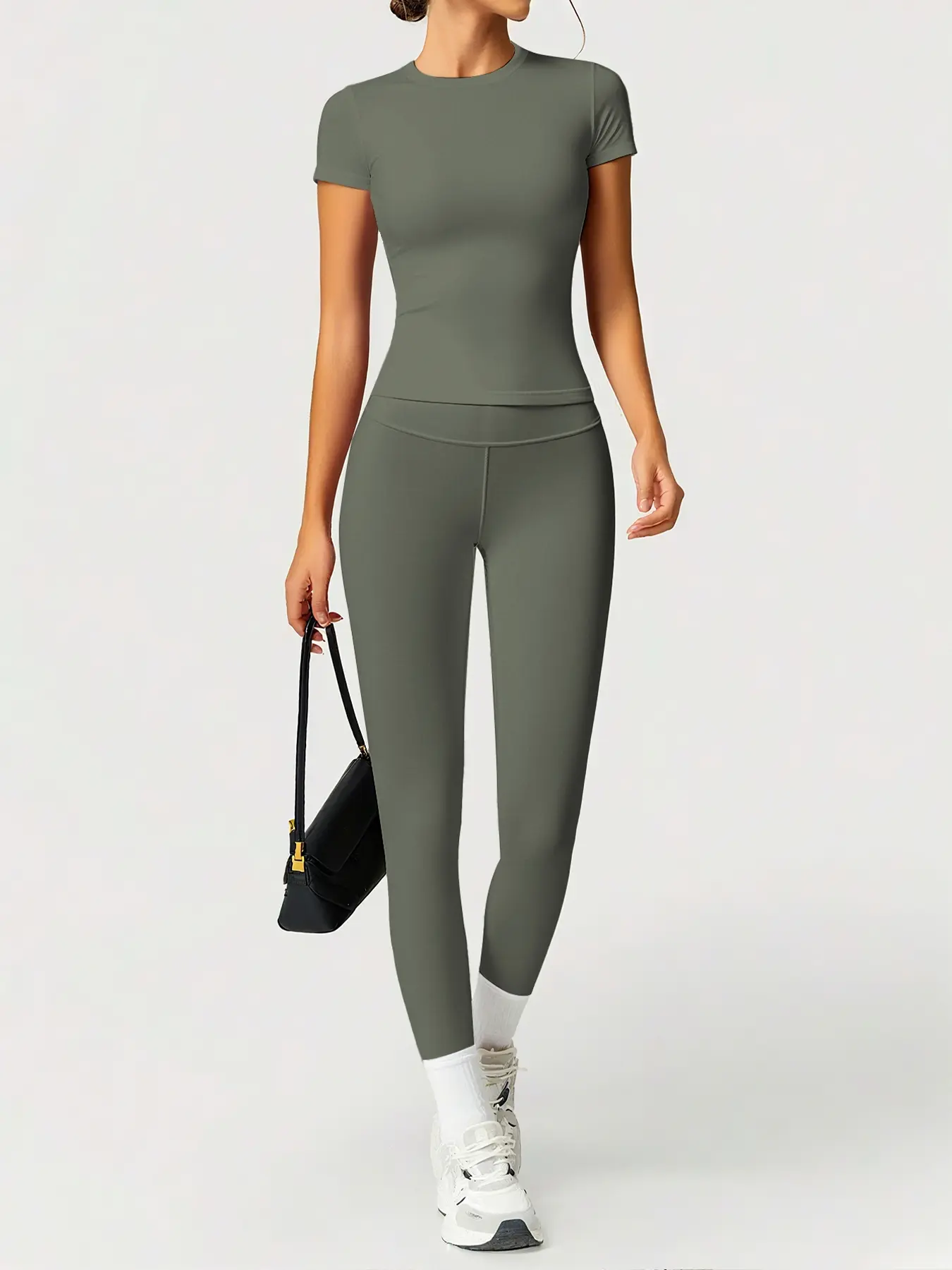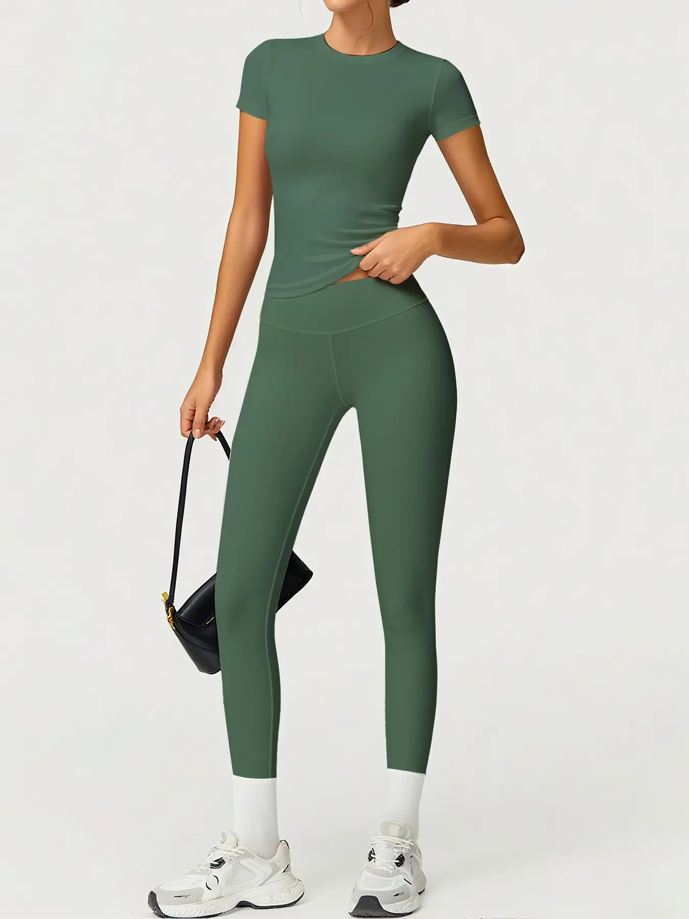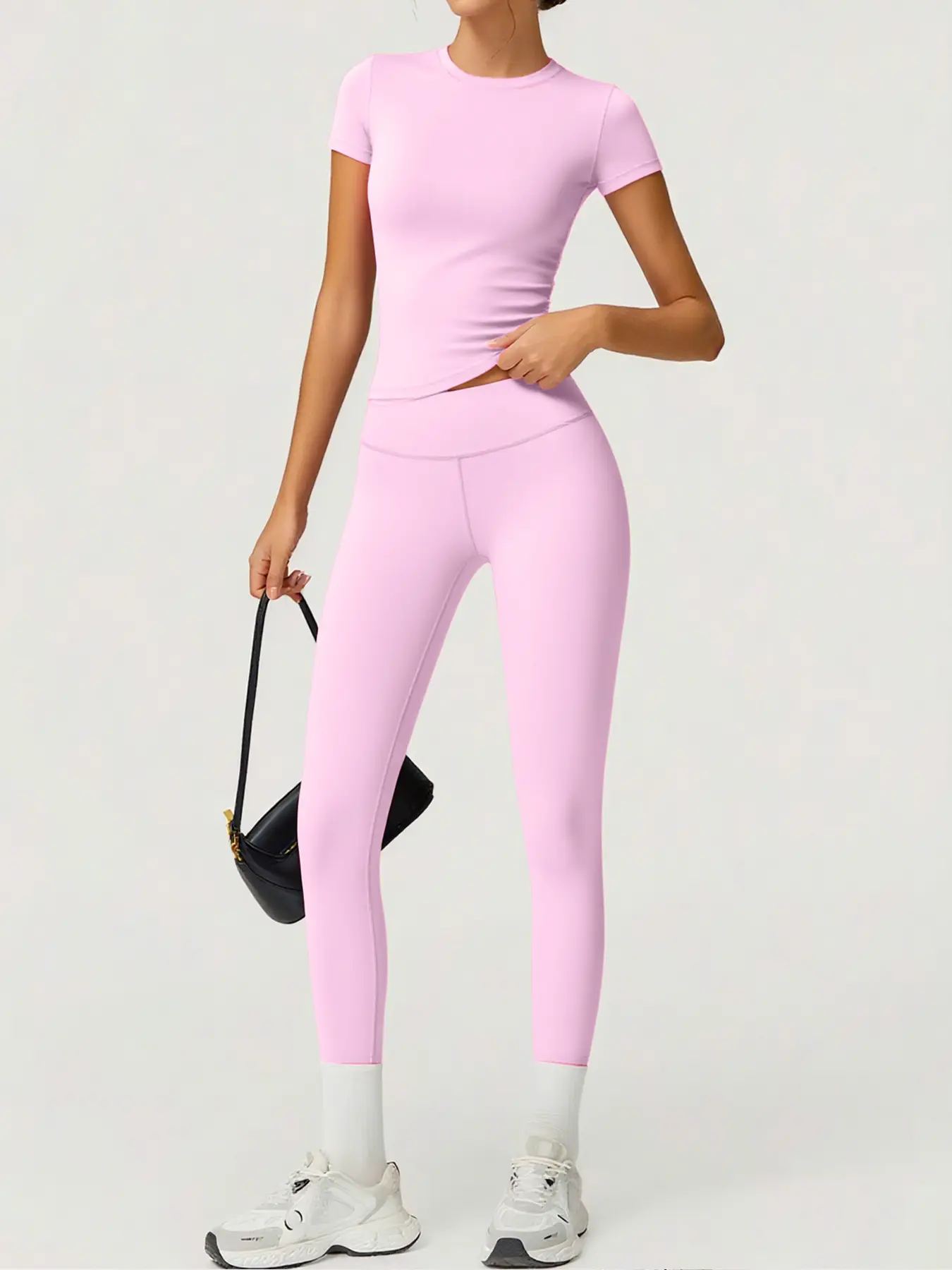 Women's Sporty Fitted Yoga Tracksuit Set, Soft Breathable Stretch Fabric Activewear Short Sleeve Top & Elastic Pants, Ideal for Fitness Running Outdoor Activities