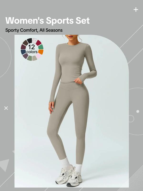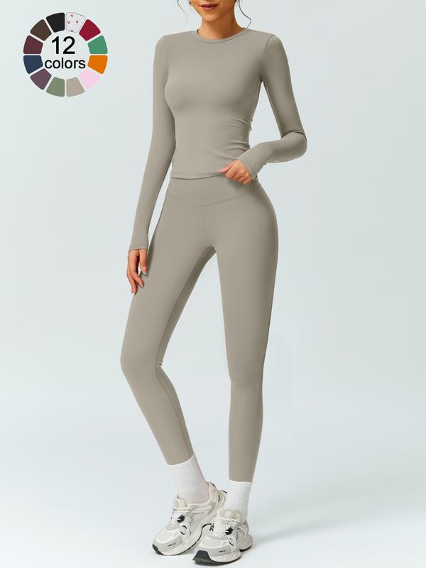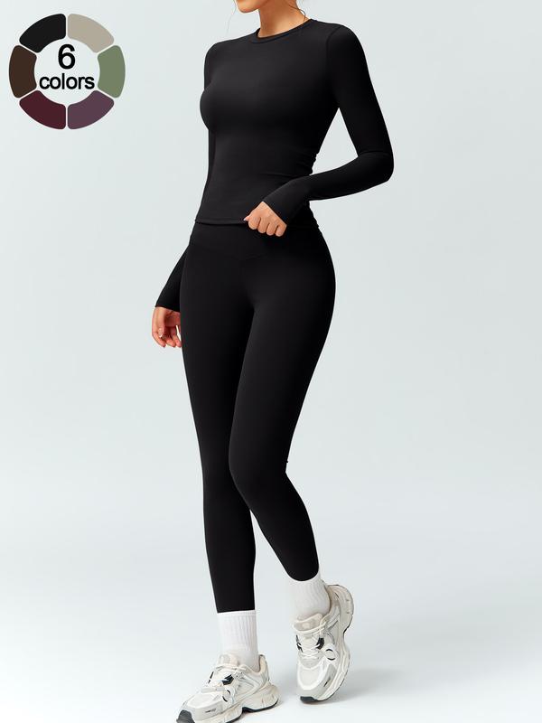 Women's Solid Color Long Sleeve Tee & High Waist Leggings Tracksuit Set, Athletic Activewear Tracksuits, Sporty Comfy Breathable Outfits for Gym Workout Running, Ladies Fall & Winter Sportswear