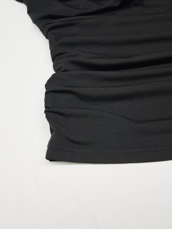 5. Women's Spring Autumn Fashion Knit Lace Trim Long Sleeve Top, V Neck Slim Fit Ruched Elastic Elegant Casual T-Shirt
