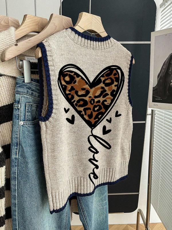 5. Women's Spring Summer Casual Loose Round Neck Sleeveless Knit Top, Deep Blue Contrast Binding Heart Leopard Print, Outerwear & Layering