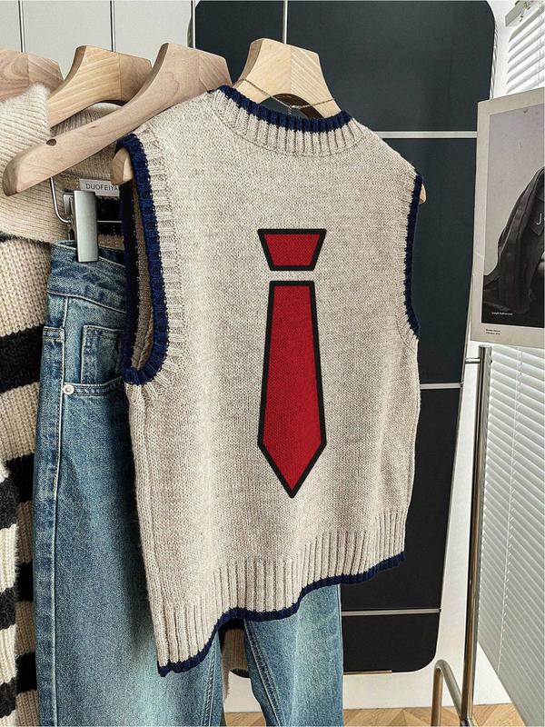 One piece + Women's spring/summer casual-retro loose-fit round-neck sleeveless knit top. Deep blue contrast trim + red-scarf patchwork print. Perfect for school vibes - layer with a vest or wear it solo! Color Block Vest