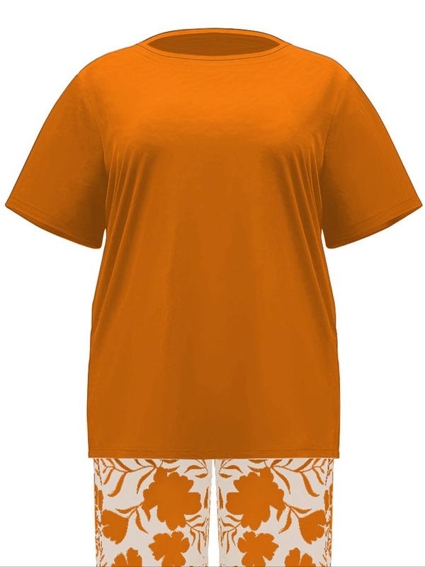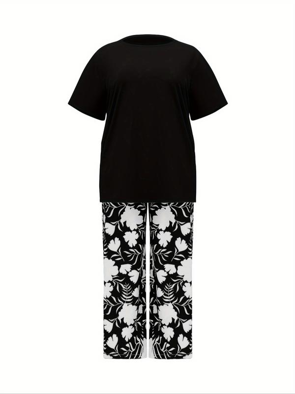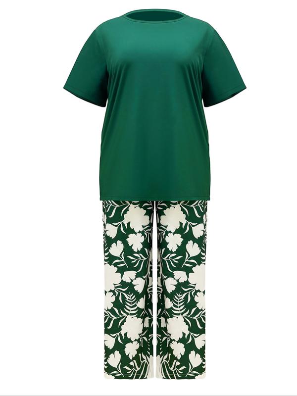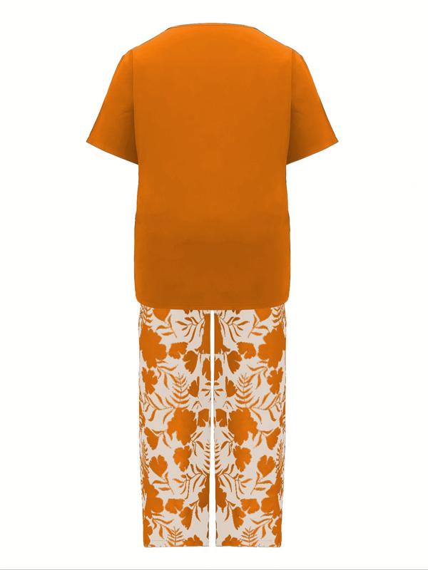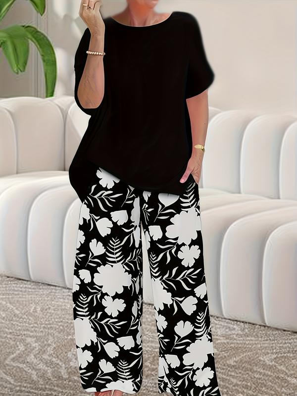 Women's Spring Summer Round Neck Loose Fit Top and Printed Long Pants Casual Set, Comfortable and Stylish for Daily Wear