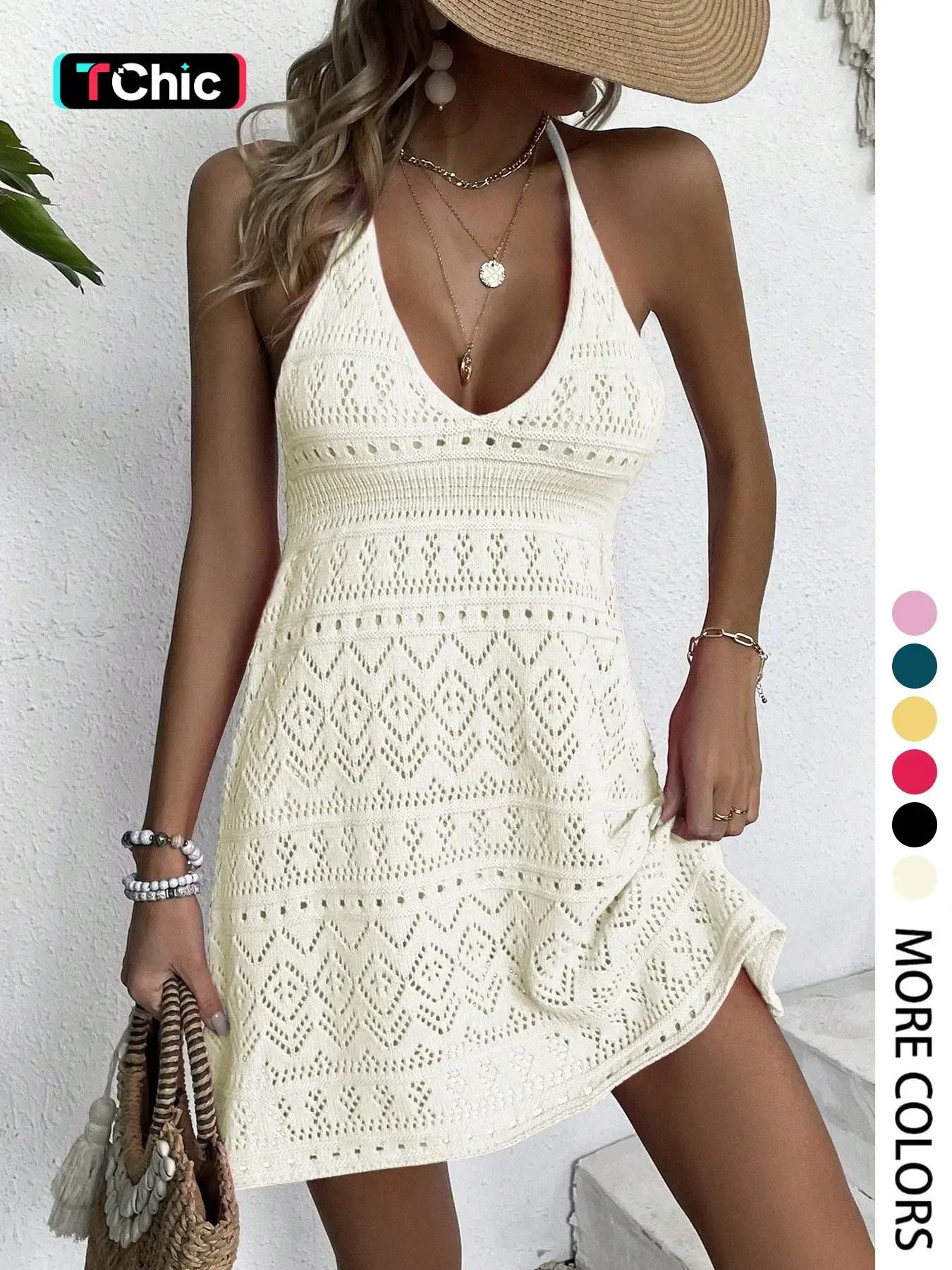 Casual Halter Backless V-Neck Hollow-Out Knit Dress #summerwear #dress #spotlightfinds #tiktokshopcreatorpicks #tiktokshopspringglowup