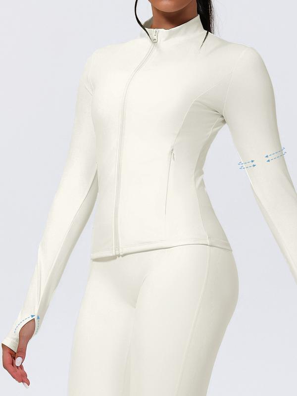 Women's Stand Collar Zipper Yoga Jacket, Windproof Slim Fit Long Sleeve Running Outerwear, Pockets Design, Polyester Spandex Fabric Only Jacket,jackets for women, Sports Yoga Jacket