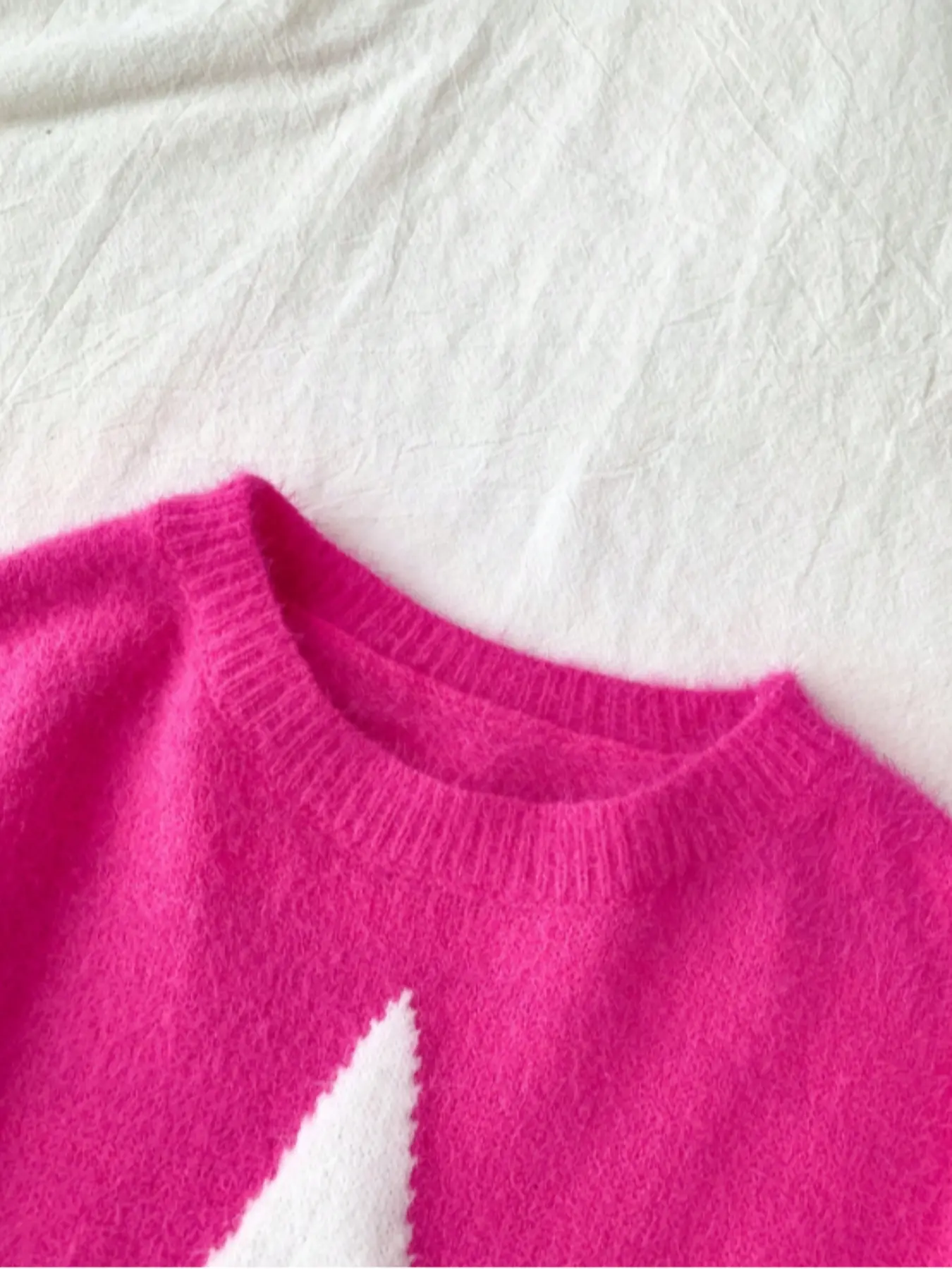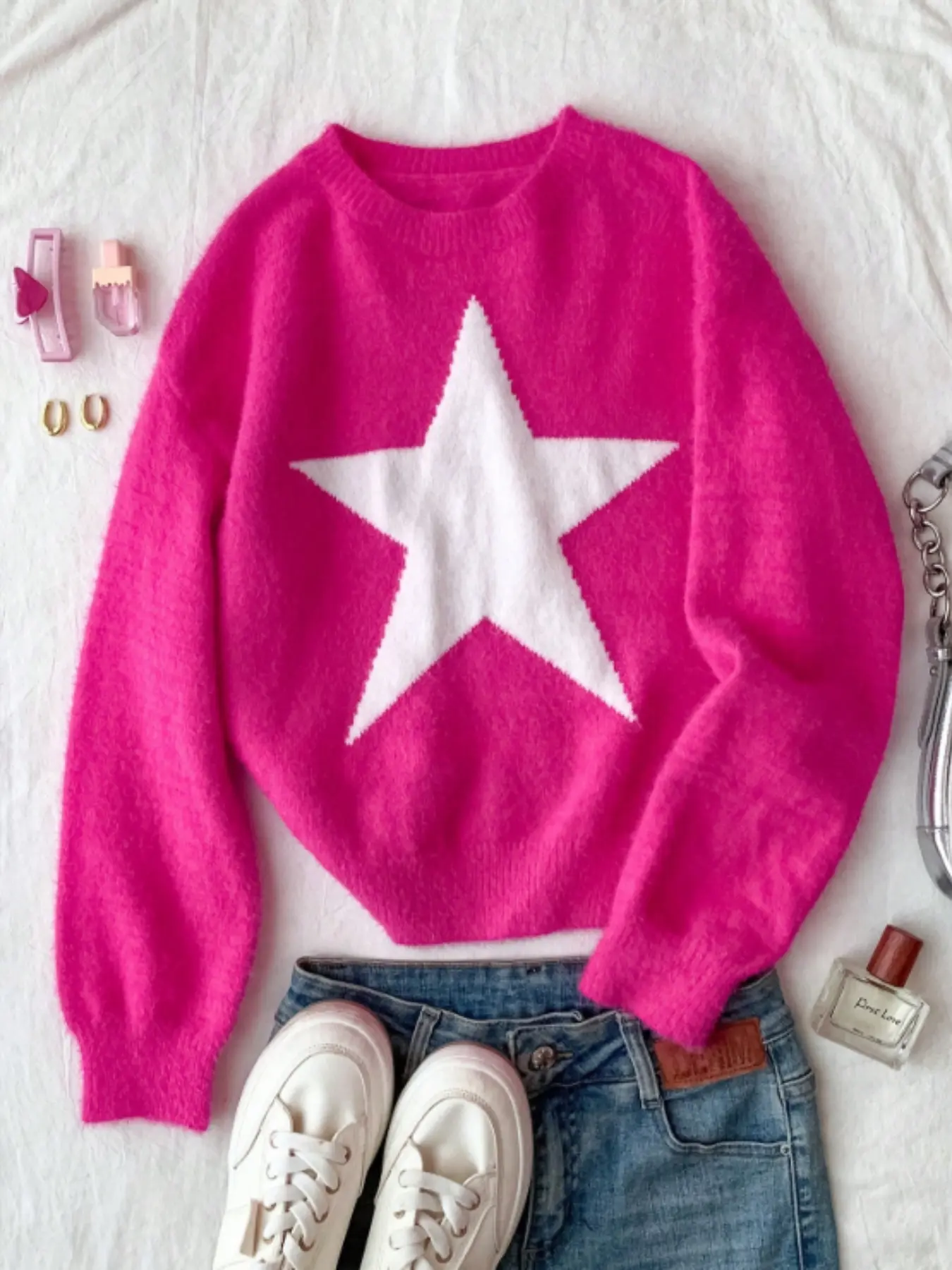 Women's Star Pattern Knit Pullover Long Sleeve, Soft Puffy Round Neck Sweater, Casual Fitted Fall/winter Clothing, Comfortable and Stylish