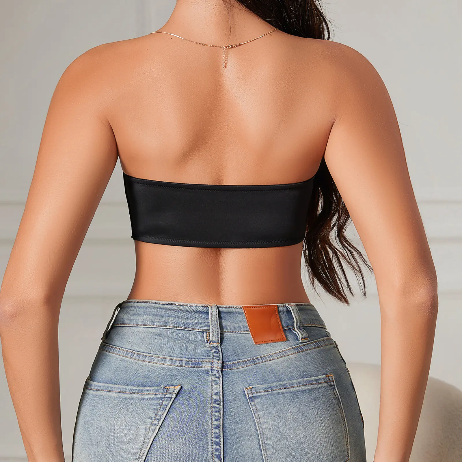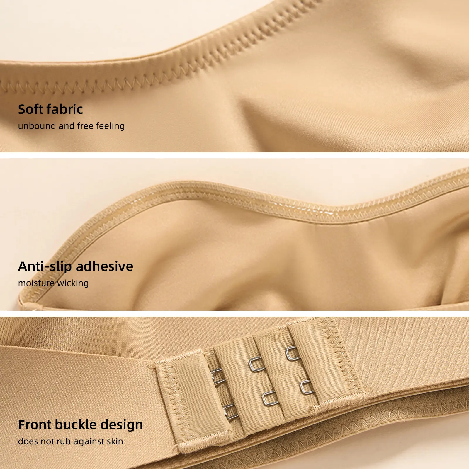 Strapless front-closure bandeau bra with jelly gel strip for light, comfortable hold. Designed for smaller busts – provides subtle shaping, not heavy lift or full support. Great for casual wear, off-shoulder tops, and dresses. Use clear straps when you need extra lift & security.