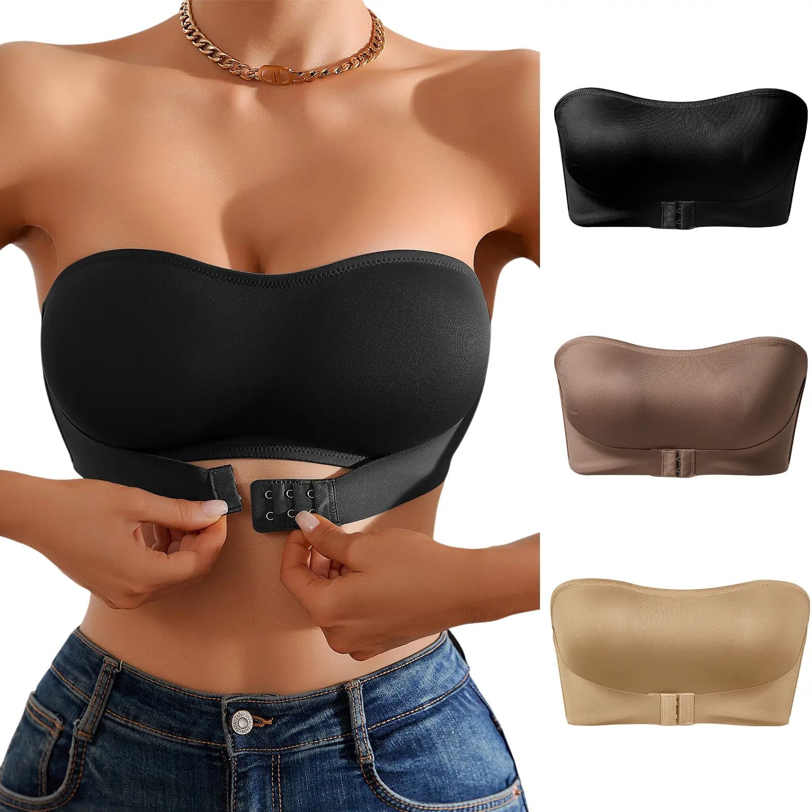 3 Pack Strapless Bras for Women Non-Slip Silicone No Padded Bandeau Bra Wireless Tube Top Front Closure Bra Womenswear
