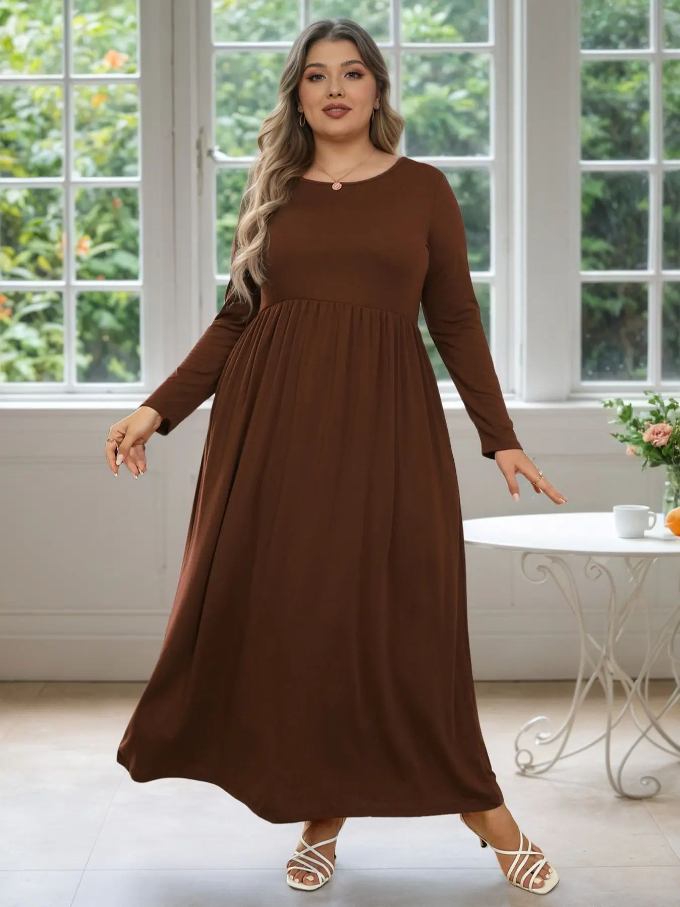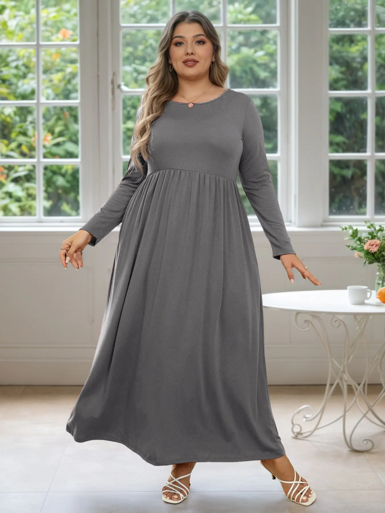 Women's Round Neck Stretchy Casual Fitted Long Plus Size Dress, Perfect for Bridesmaids, Vintage Style Wedding & Party Wear, Comfortable Fabric