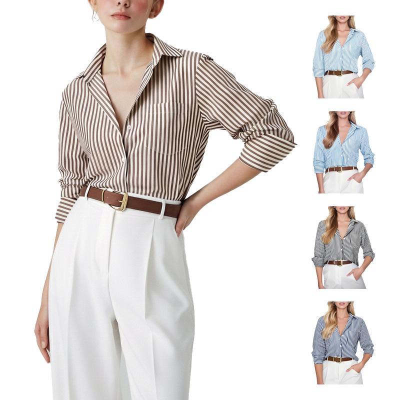 ✨ Wrinkle-Free and Breathable ✨ This striped shirt for women is made from wrinkle-free, non-iron, breathable fabric. The V-neck design with fashionable stripes enhances your charm effortlessly. The material ensures comfort and ease of wear.