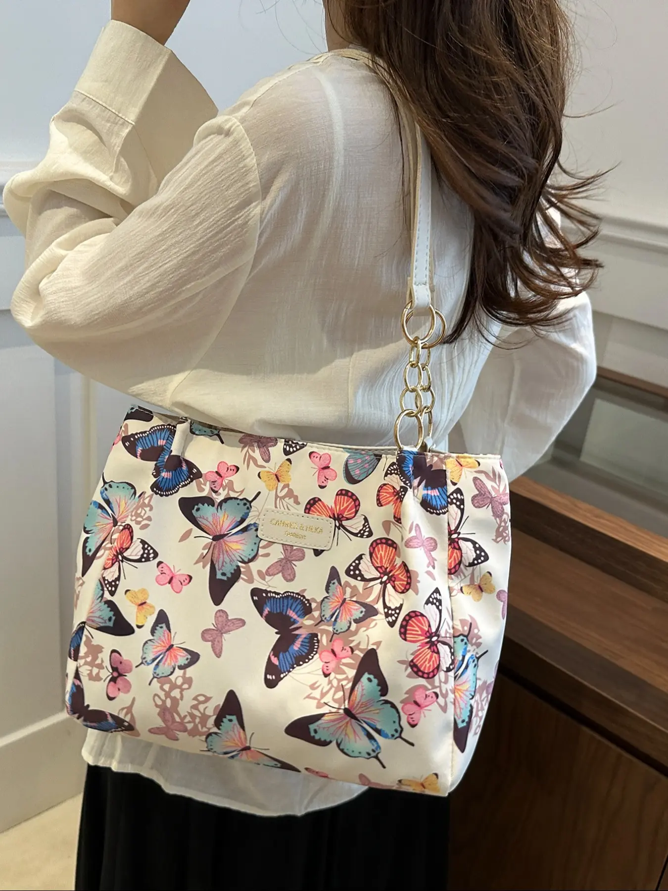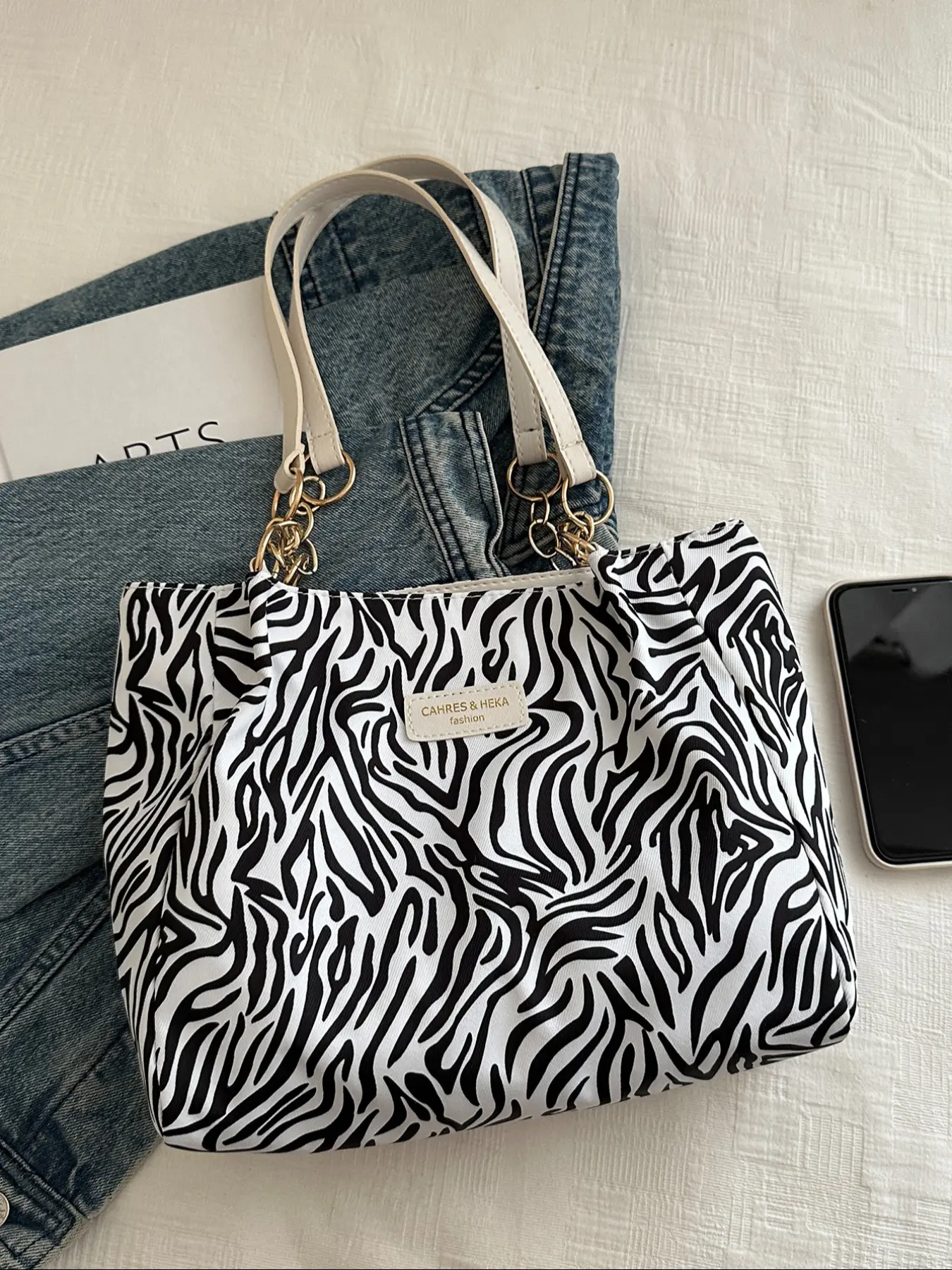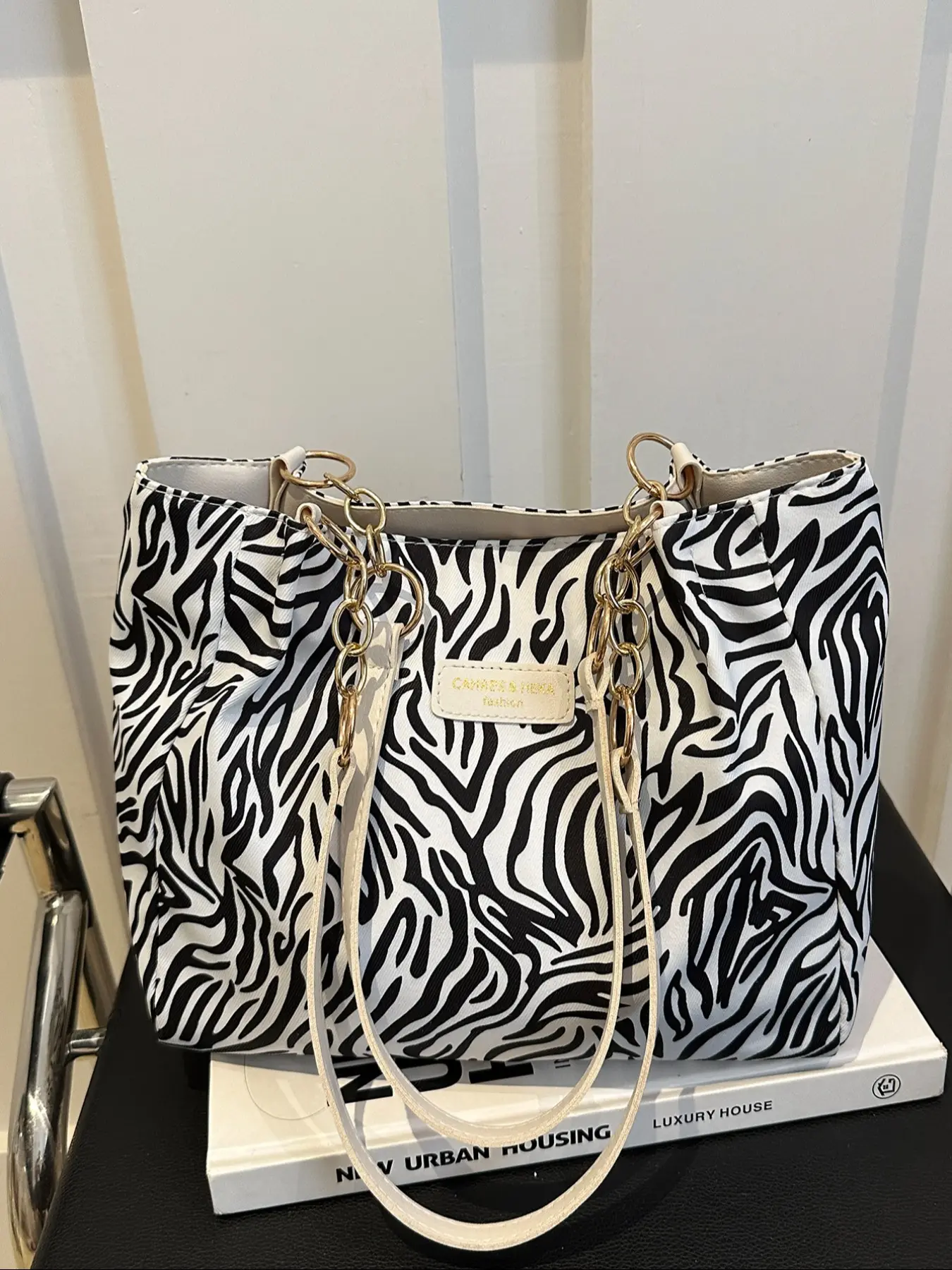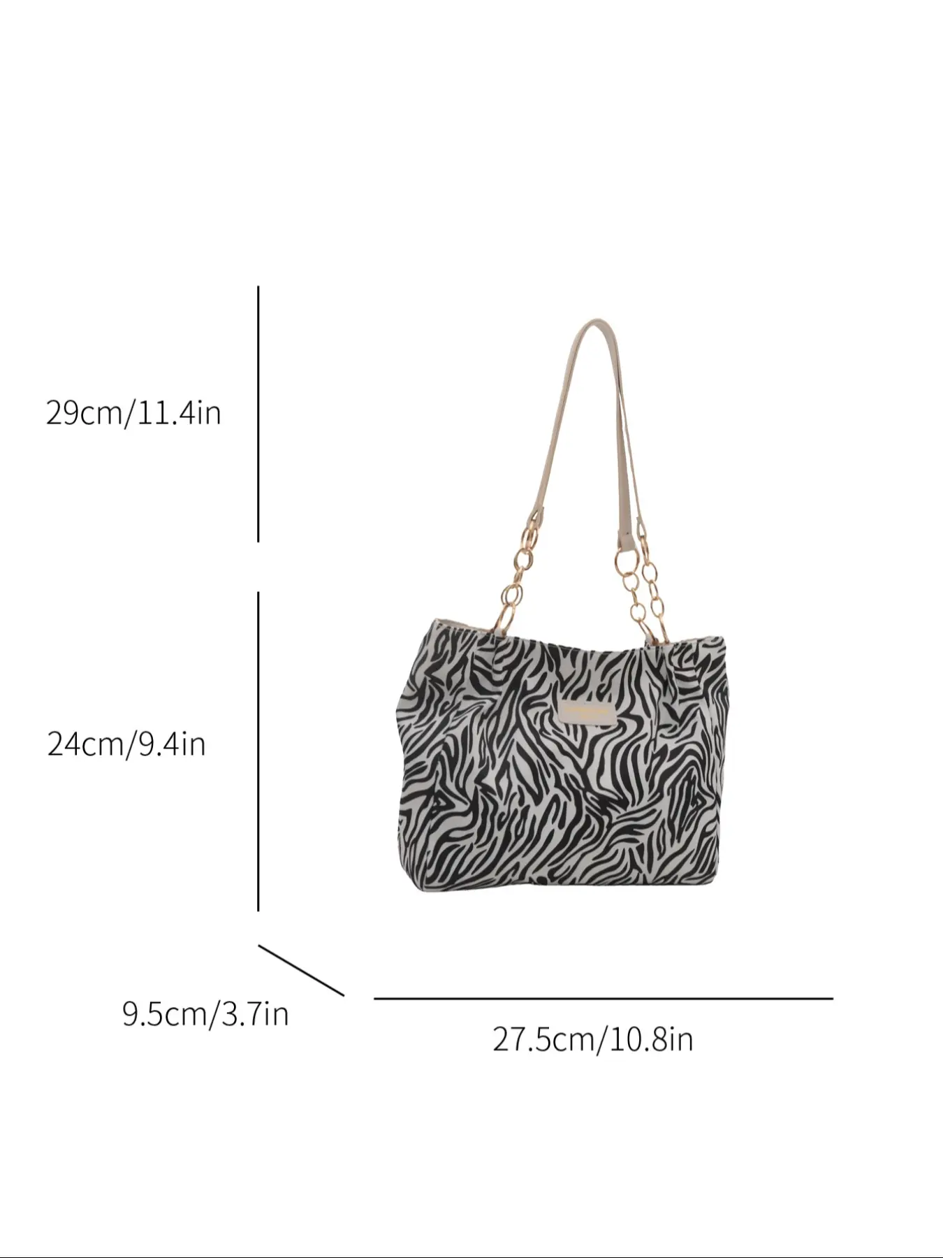 Women's Fashion Striped Handbag, Large Capacity Shoulder Bag with Metal Chain Strap, Waterproof Nylon Material, Ideal for Daily Use, Fashionable Patterned Bag