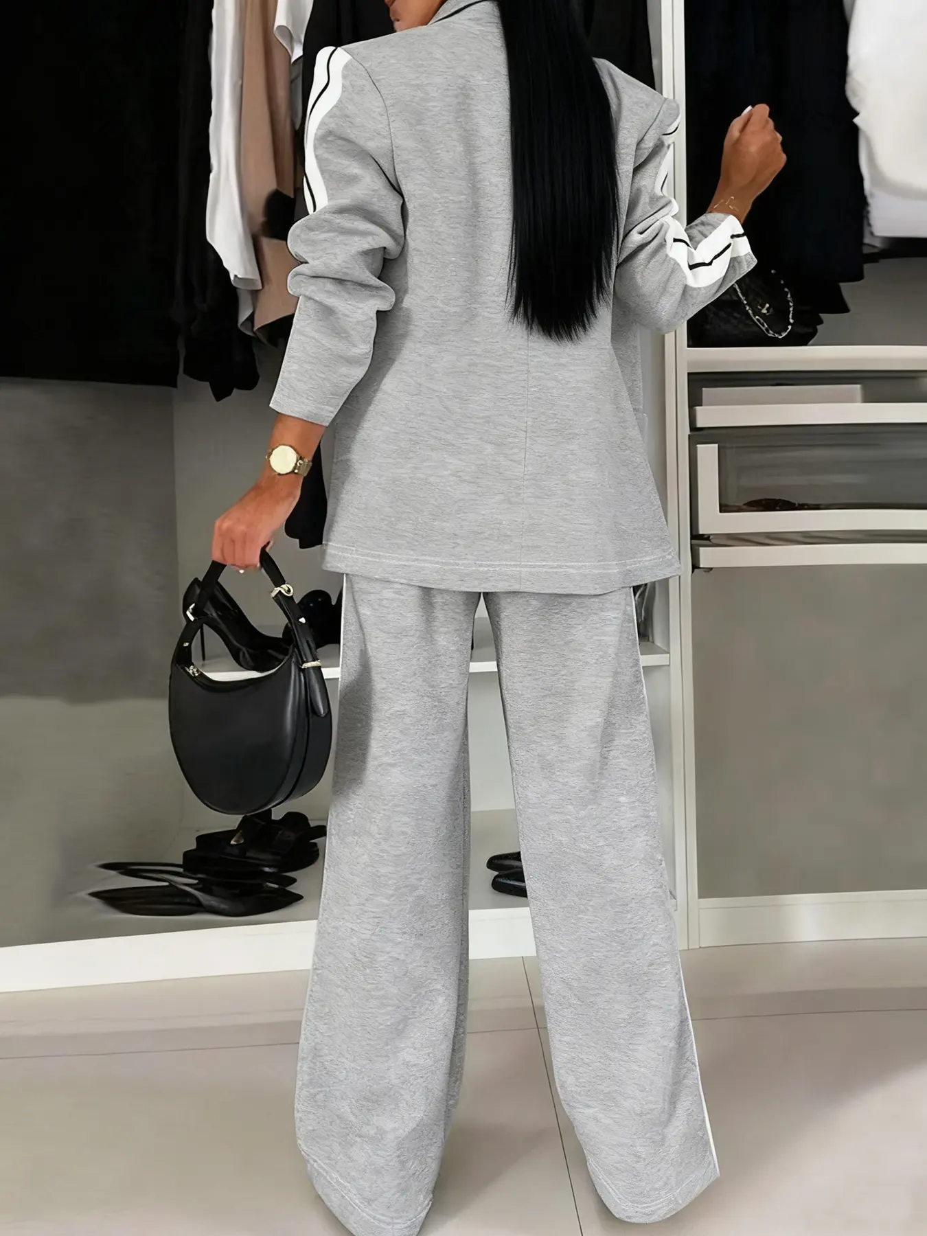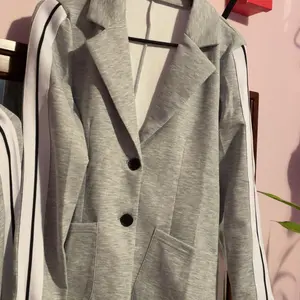 Es sin dudas un lindo conjunto de pantalón y chaqueta sport, lo.pedi blanco, ahora pienso debí pedirlo gris, ..la tela del conjunto es excelente, de un blanco brillante pero las listas de.los contados son de una especie de falla de un blanco hueso con un vista negra ..luce genial .