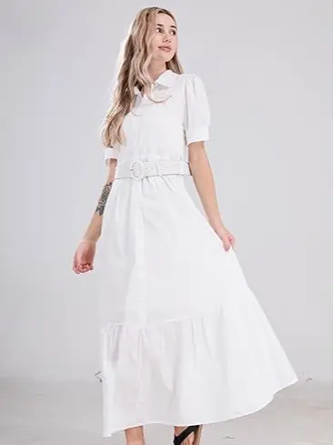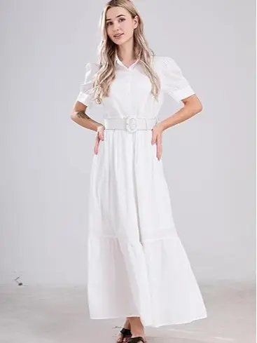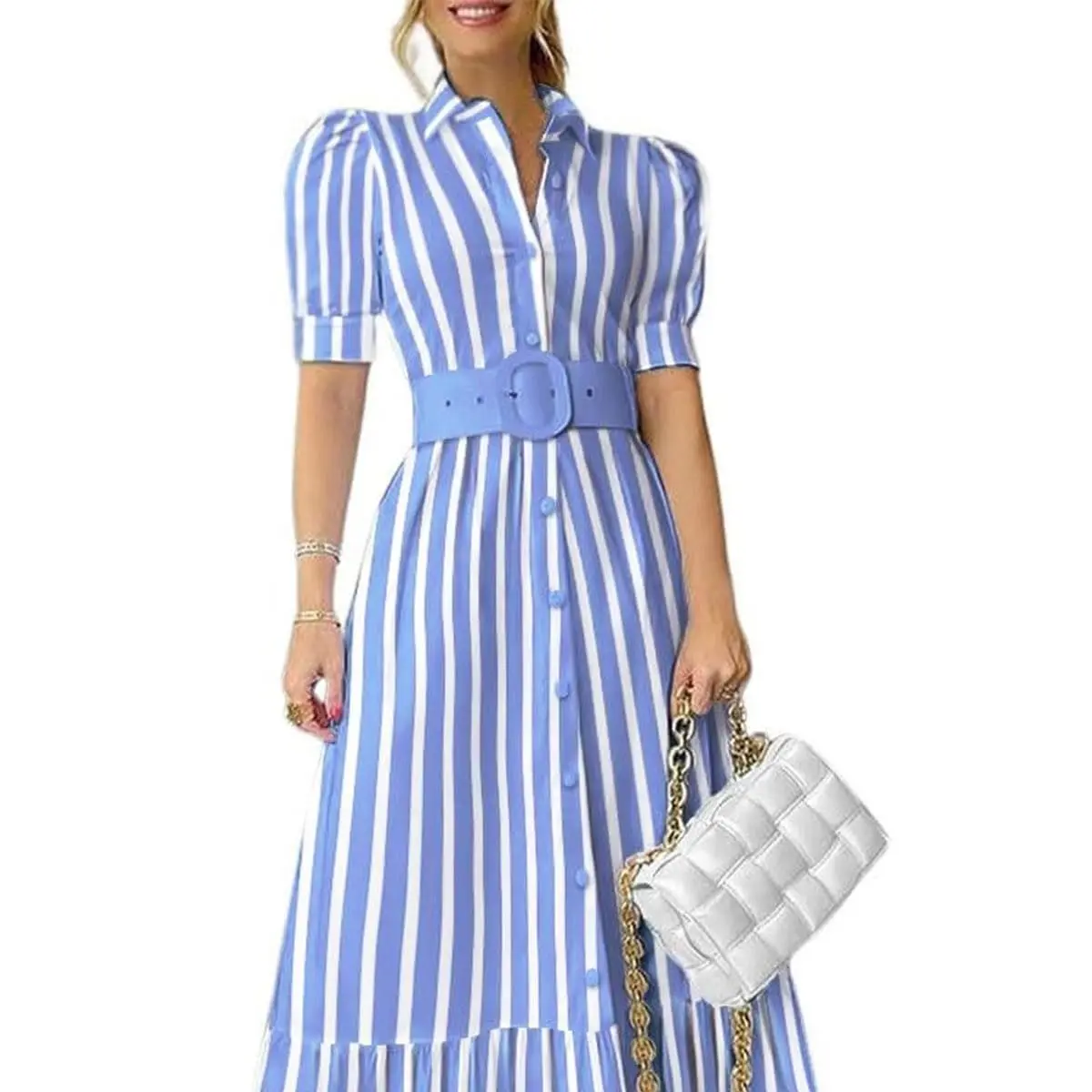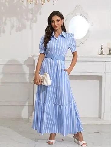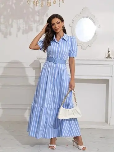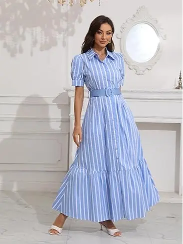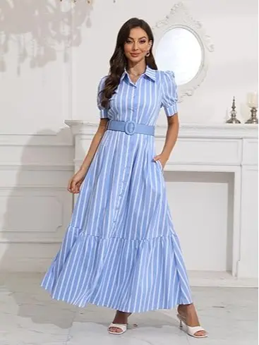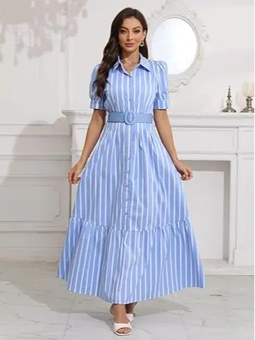 ·【STYLISH DESIGN】This 2026 trendy striped button down dress features a faux leather belt, contrast color stripes/solid color, puff short sleeves, lapel collar, high waist, slimming fit, ruffled hemline and a-line silhouette make this long dress chic and flattering. This elegant maxi shirt dress is perfect for the woman who wants to keep charming & comfy all the time.