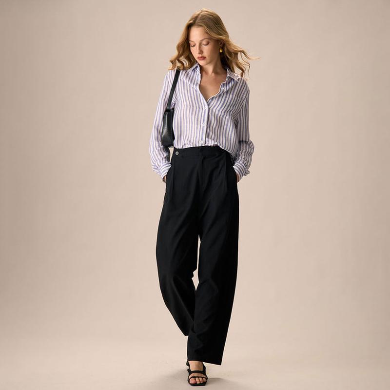 These High-waisted Pants are made of Polyester. Polyester is an artificial fiber that feels soft, looks lustrous, and dries fast. It's also durable, with good resistance to wrinkles, stains, and sunlight.
