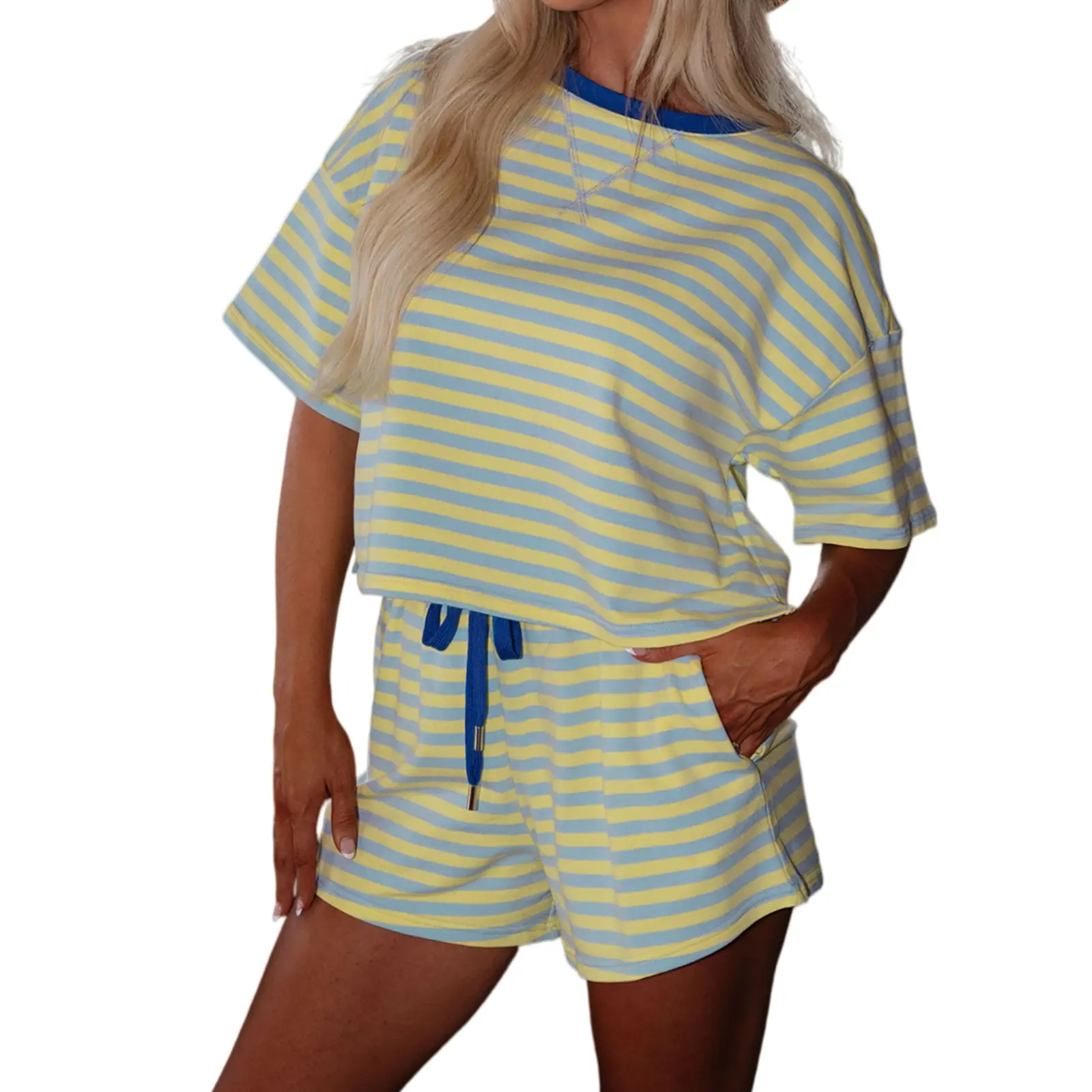 Asvivid Women's Stripe Drop Shoulder Boxy Casual T Shirt and Short Set