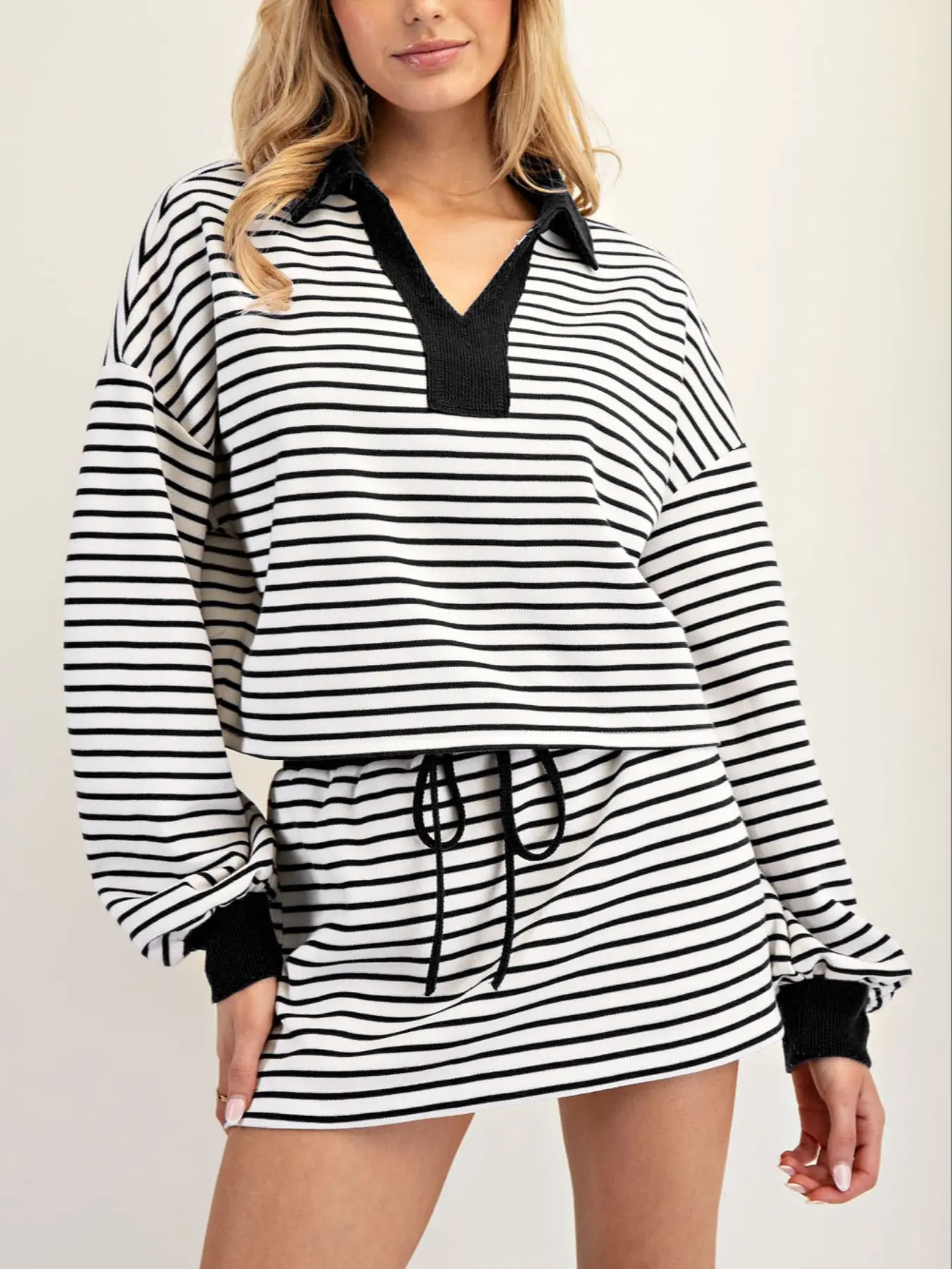 LOVE this set! Super cute and comfy. Not too thin or thick. I’m normally a size 6 and got a medium. Fits great and skort not too short/long